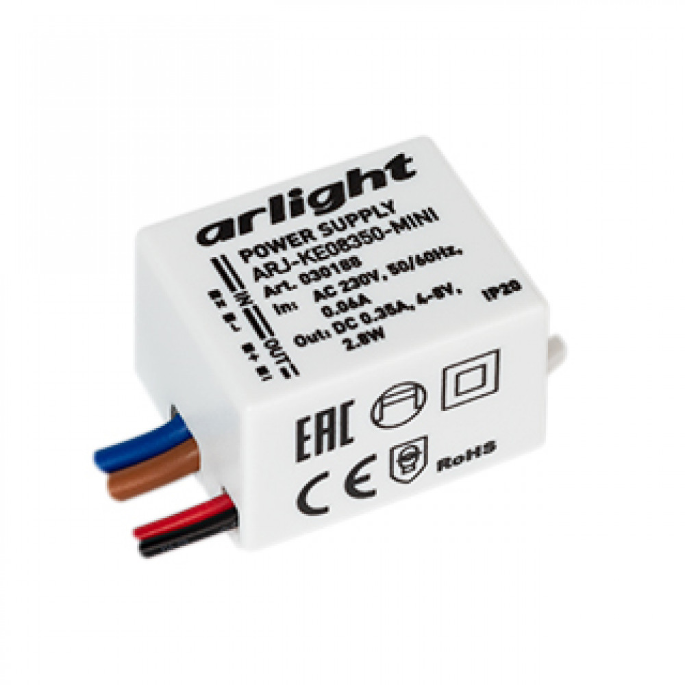 Блок питания ARJ-KE08350-MINI (2.8W, 350mA) 030188, Источник тока с гальванической развязкой для светильников и мощных светодиодов. Входное напряжение 220-240 VAC. Выходные параметры: 4-8 В, 350 mА, 2.8 Вт. Встроенный PFC >0.4. Негерметичный алюминиевый корпус IP 20. Габаритные размеры длина 34 мм, ширина