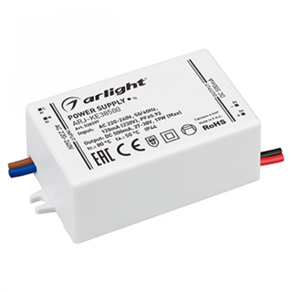 Блок питания ARJ-KE38500 (19W, 500mA, PFC) 028397, Источник тока с гальванической развязкой для светильников и мощных светодиодов. Входное напряжение 220-240 VAC. Выходные параметры: 27-38 В, 500 mА, 19 Вт. Встроенный PFC >0.92. Негерметичный пластиковый корпус IP 44. Габаритные размеры длина 68 мм, ширин
