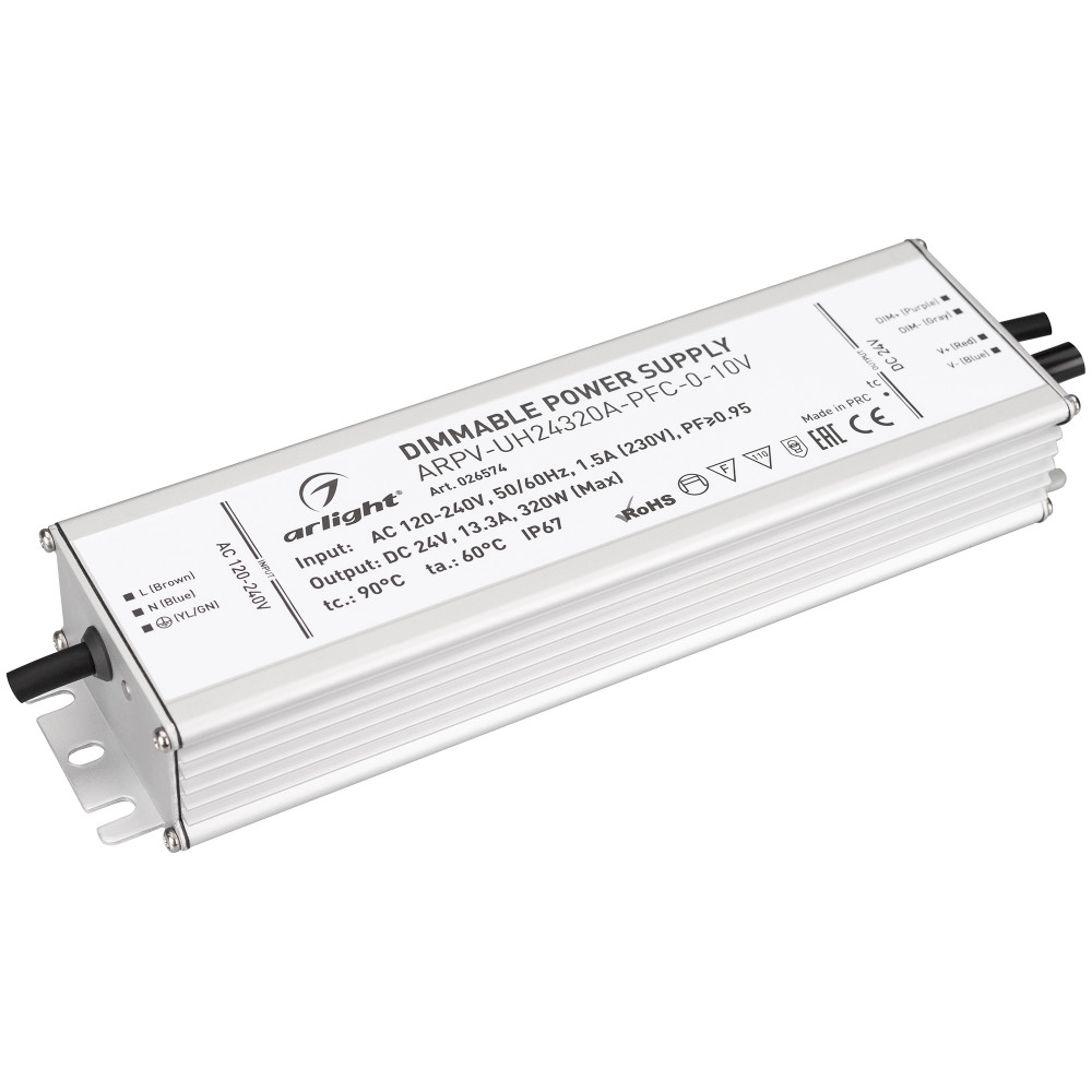 Блок питания ARPV-UH24320A-PFC-0-10V (24V, 13.3A, 320W) 026574, Диммируемый источник напряжения по стандарту 0-10 В с гальванической развязкой для светодиодных изделий. Входное напряжение 120-240 VAC. Выходные параметры: 24 В, 13.3 А, 320 Вт. Встроенный PFC >0.95. Герметичный алюминиевый корпус IP 67. Рабочая температ