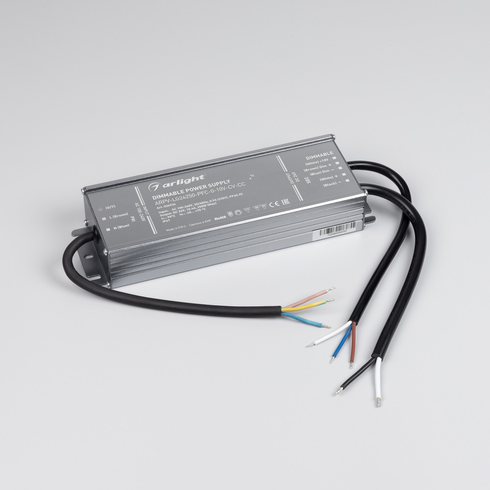 Блок питания ARPV-LG24250-PFC-0-10V-CV-CC (24V, 10.4A, 250W) 036936, Диммируемый источник напряжения с переходом в режим источника тока по стандарту 1-10 В без полного гашения (также доступно диммирование с помощью резистора 10кОм) с гальванической развязкой для светодиодных изделий. Входное напряжение 100-240 VAC. Выходны