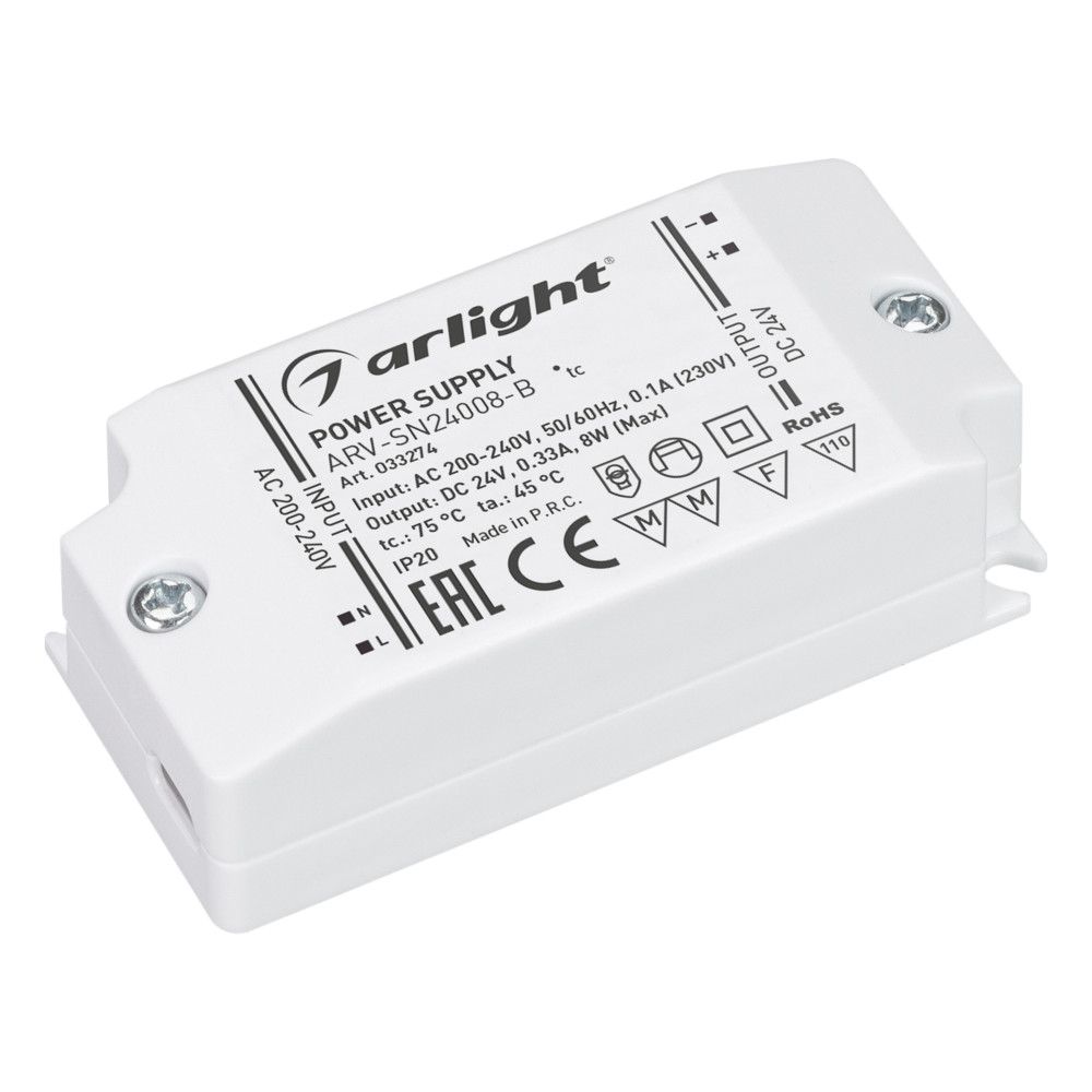 Блок питания ARV-SN24008-B (24V, 0.33A, 8W) 033274, Источник напряжения с гальванической развязкой для светодиодных изделий. Входное напряжение 200-240 VAC. Выходные параметры: 24 В, 0.33 А, 8 Вт, PF>0,5. Негерметичный пластиковый корпус IP 20. Габаритные размеры длина 67 мм, ширина 33 мм, высота 19.8 мм .