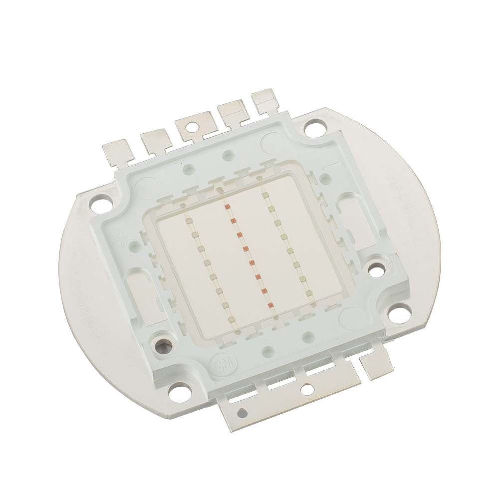 Мощный светодиод типа COB, размер 52?56 мм. Чипы EPILEDS 32-35 mil. Цвет свечения RGB: красный (620-630 нм), зеленый (520-530 нм), синий (460-470 нм). Угол излучения 120°. Световой поток 350-400 лм (красный), 500-550 лм (зеленый), 140-180 лм (синий) при I