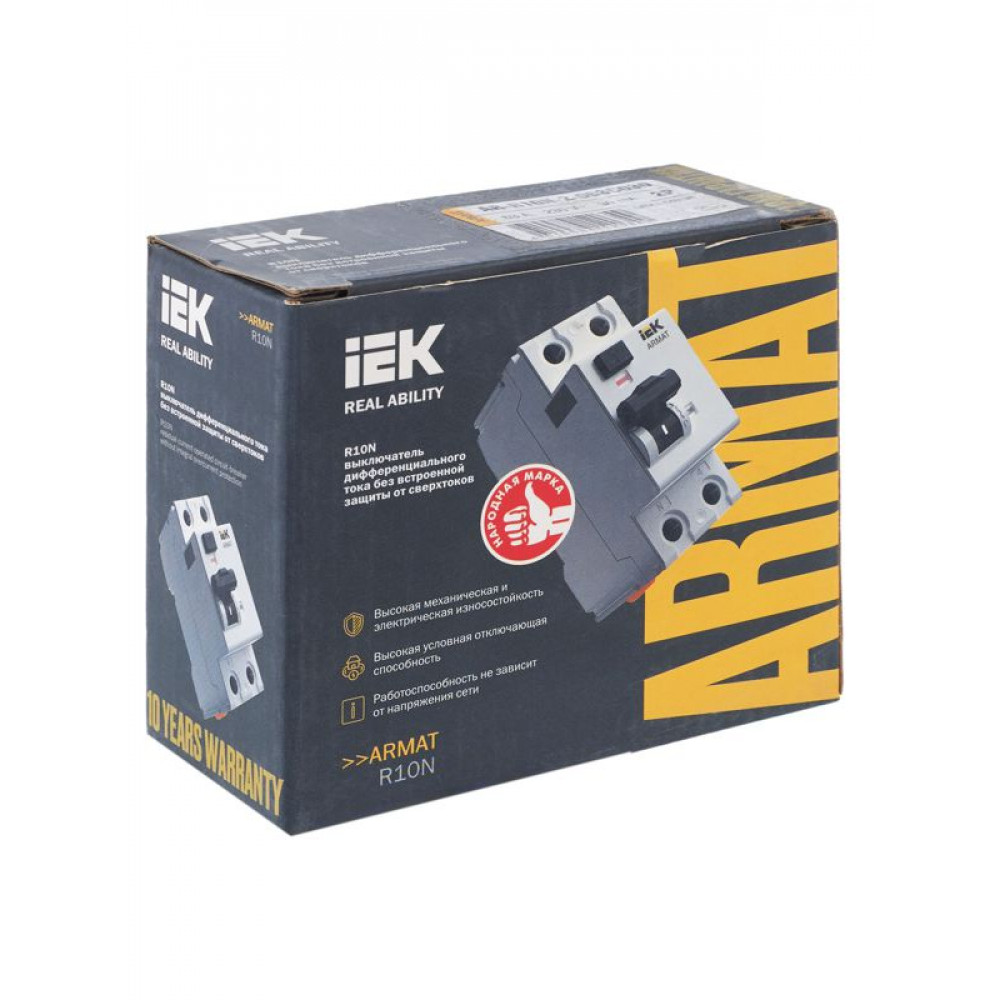 Выключатели дифференциального тока ARMAT серии R10N выполняют функцию защиты поражения человека электрическим током, а так же защиты от пожара при возникновении замыкания на землю. Модельный ряд включает в себя устройства с типами защитных характеристик по дифференциальному току AC, A, AC-S, A-S; номинальными токами от 25 до 100 А; номинальными дифференциальными токами срабатывания от 10 до 300мА. Условная отключающая способность ВДТ ARMAT серии R10N составляет 10 кА.