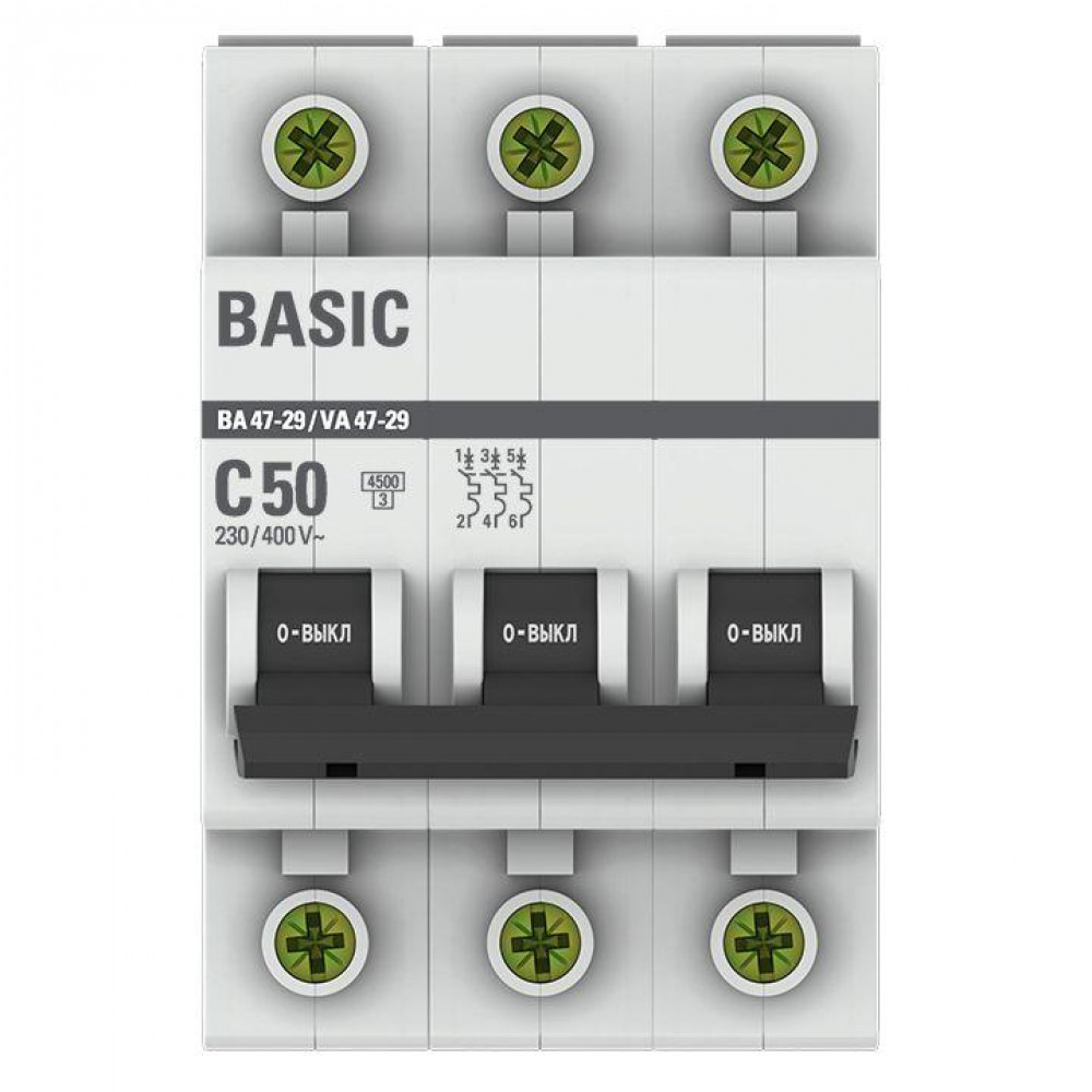 Описание Выключатель автоматический модульный 3п C 50А 4.5кА ВА 47-29 Basic EKF mcb4729-3-50C