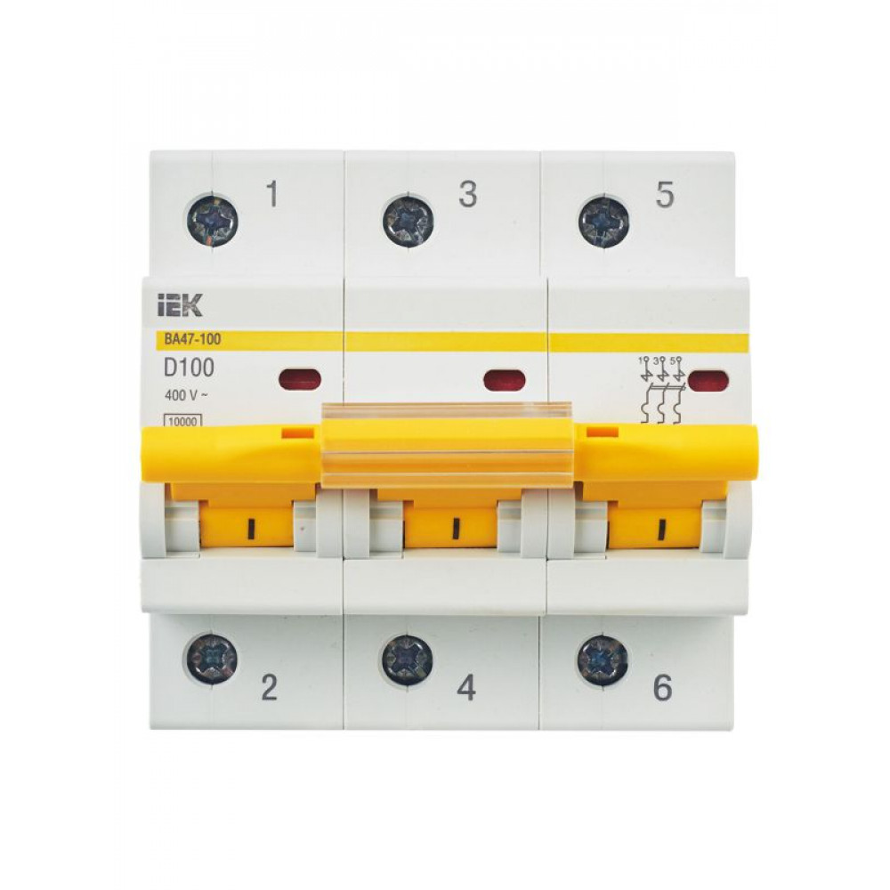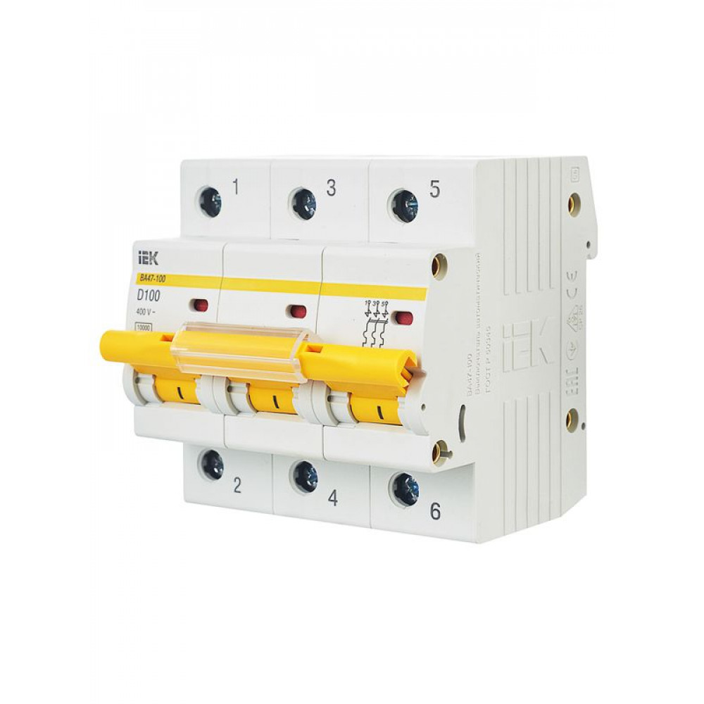 Описание Выключатель автоматический модульный 3п D 100А 10кА ВА47-100 KARAT IEK MVA40-3-100-D