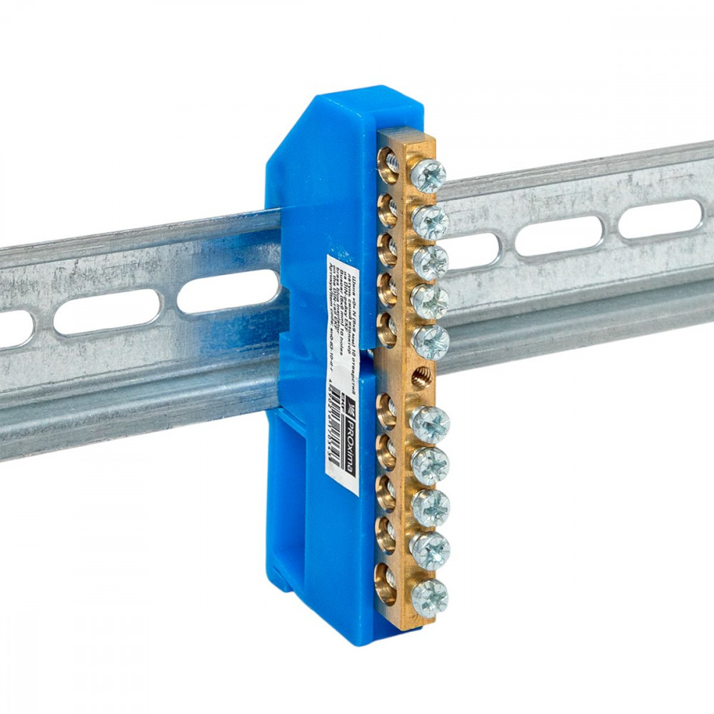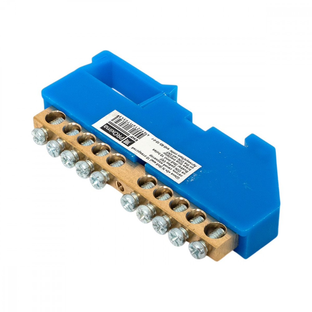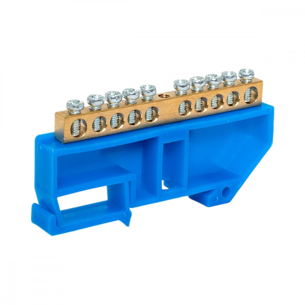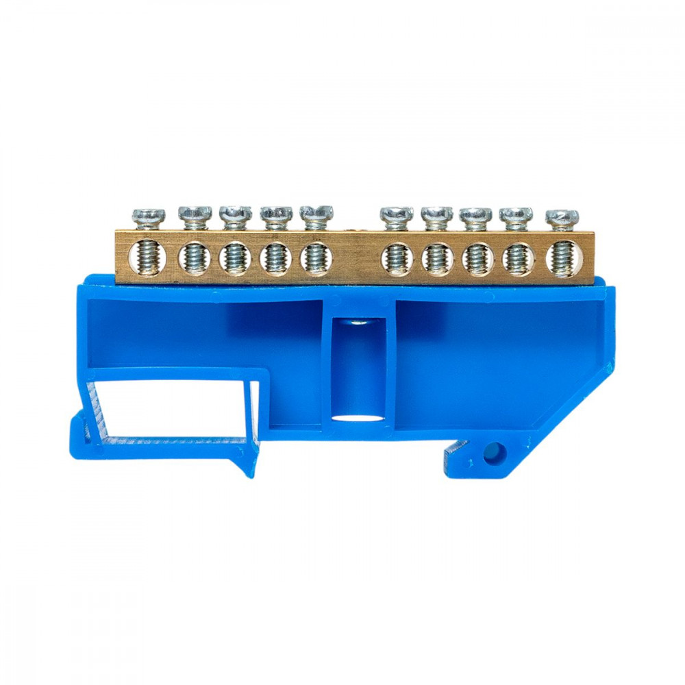Шина нулевая N 6х9 10 отверстий синий изолятор на DIN-рейку латунь sn0-63-10-d-r, Блок клеммный и нулевая шина