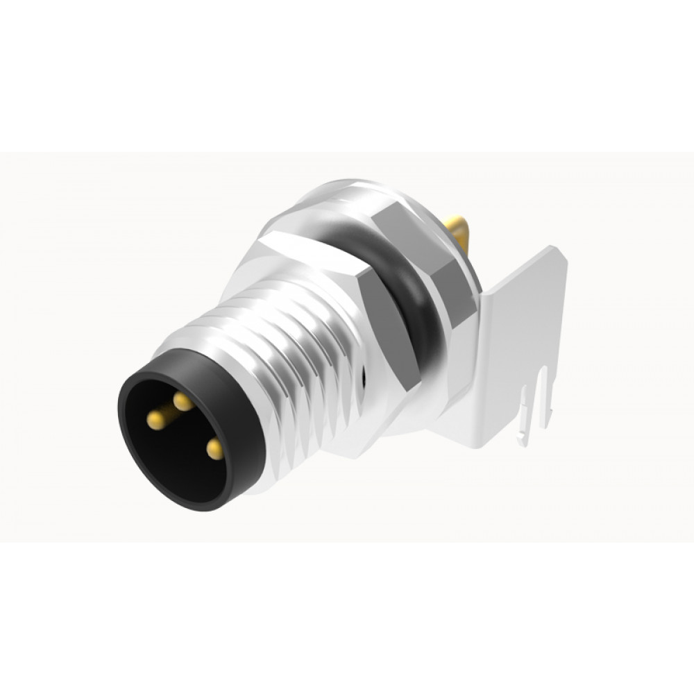 Вилочный разъем SRSH-M8A-03P-MM-SF7003, Вилочный разъем для монтажа на печатную плату, 3 полюса, M8, гайка спереди, угол 180 град., фиксация провода пайкой, A-Code, 3A, 60V, M10*0.75, металл