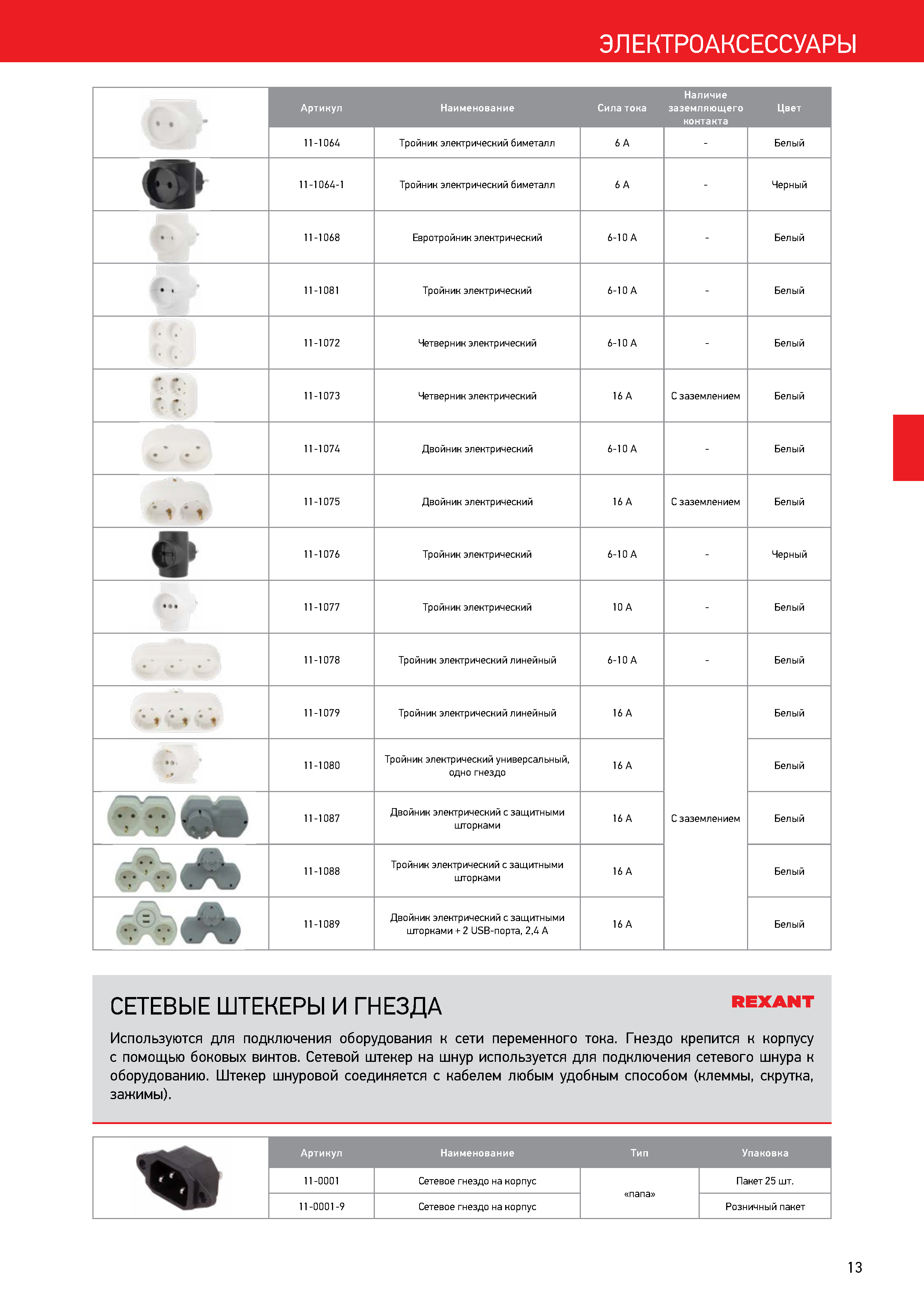 Разветвитель 3-м 6А IP20 220В биметал. бел. 11-1064, Вилка, колодка