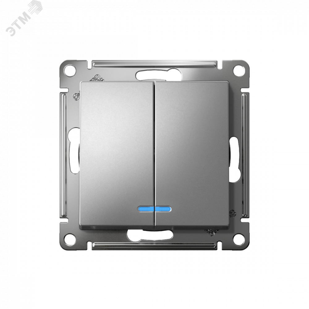 Механизм AtlasDesign (цвет сталь) выключателя 2-клавишного c подсветкой подходит для сетей 250 В, на ток 10 А.