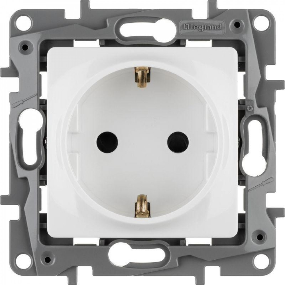 Розетка с заземлением и защитными шторками Legrand Etika для скрытого монтажа, цвет белый. Максимальный ток 16 А, максимальная мощность 3680 Вт. Применяется в зданиях, оборудованных для повышения безопасности проводкой с заземлением (с защитным проводником). Рекомендуются к применению в квартирах и помещениях с детьми. Шторки осуществляют защитную функцию путём ограничения доступа к токоведущим контактам. Доступ открывается только при подключении вилки.