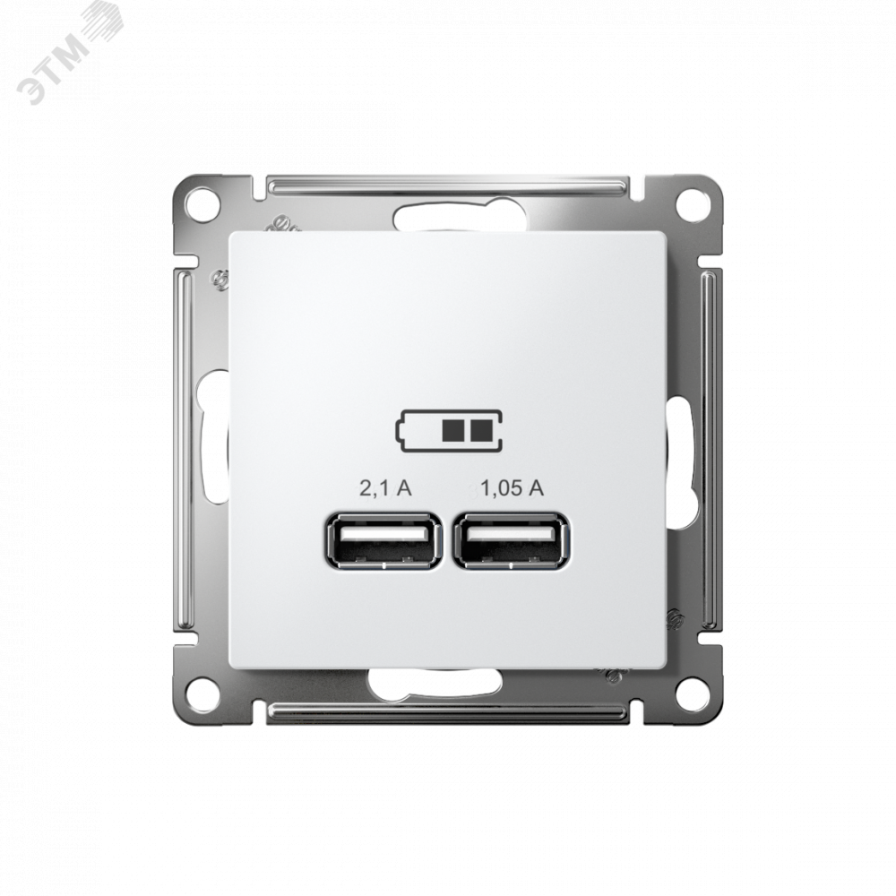 Механизм AtlasDesign (цвет белый) розетки для зарядки с двумя разъёмами USB с выходными напряжением 5 В постоянного тока и выходами с номинальным током по 2,1 А.