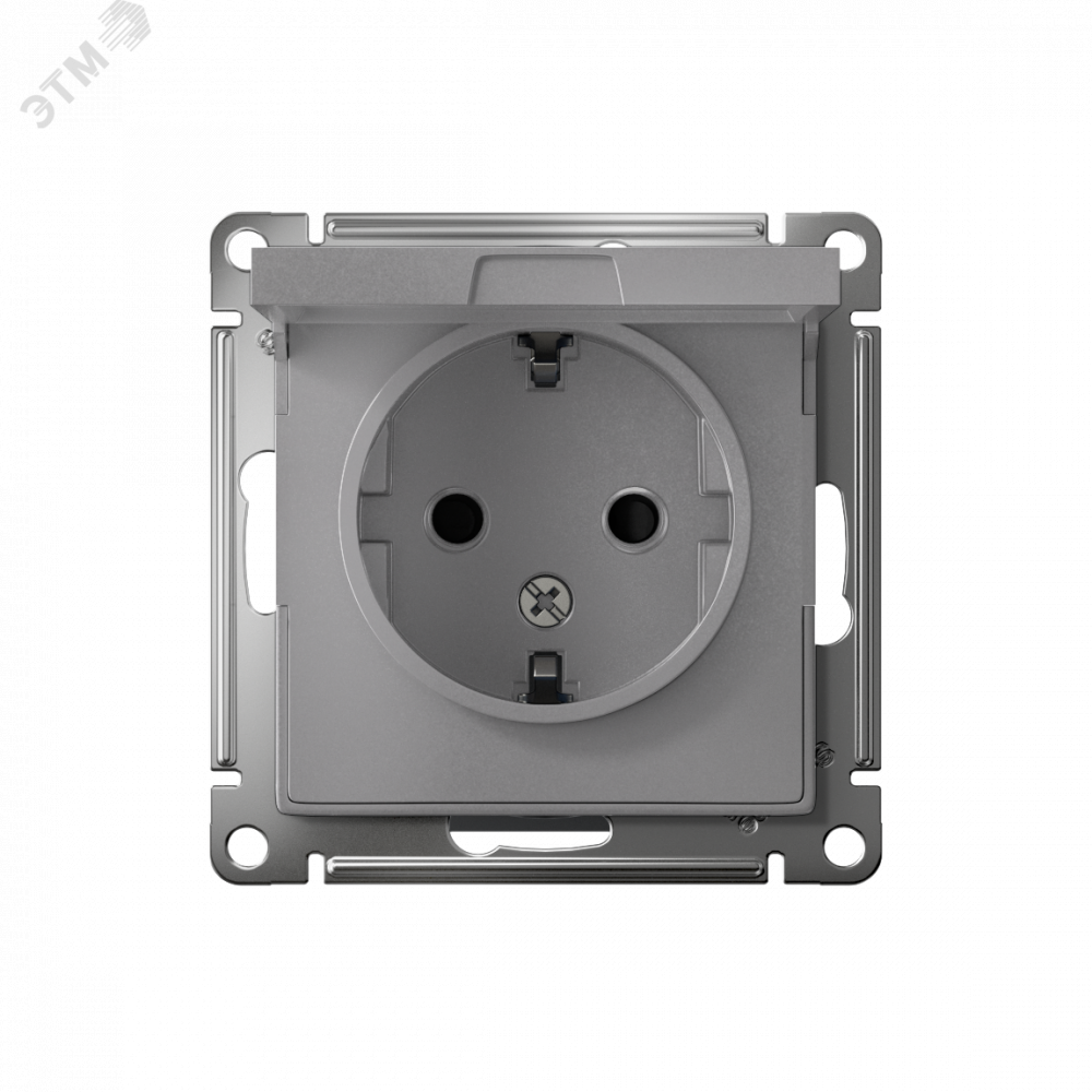 Механизм AtlasDesign (цвет алюминий) розетки одинарной с заземлением, шторками и крышкой подходит для сетей 250 В, на ток 16 А.