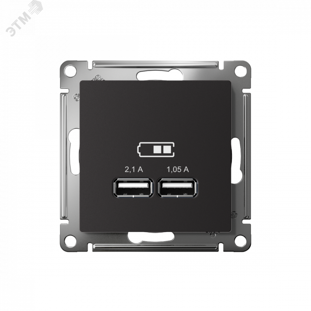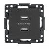 Механизм AtlasDesign (цвет карбон) розетки для зарядки с двумя разъёмами USB с выходными напряжением 5 В постоянного тока и выходами с номинальным током по 2,1 А.