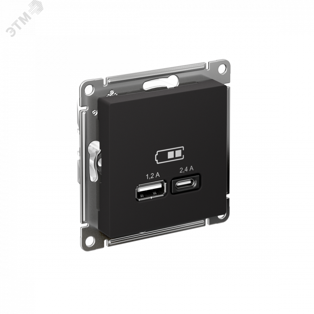 Розетка USB AtlasDesign тип A+C 5В/2.4А 2х5В/1.2А механизм карбон SE ATN001039, Розетка скрытого монтажа
