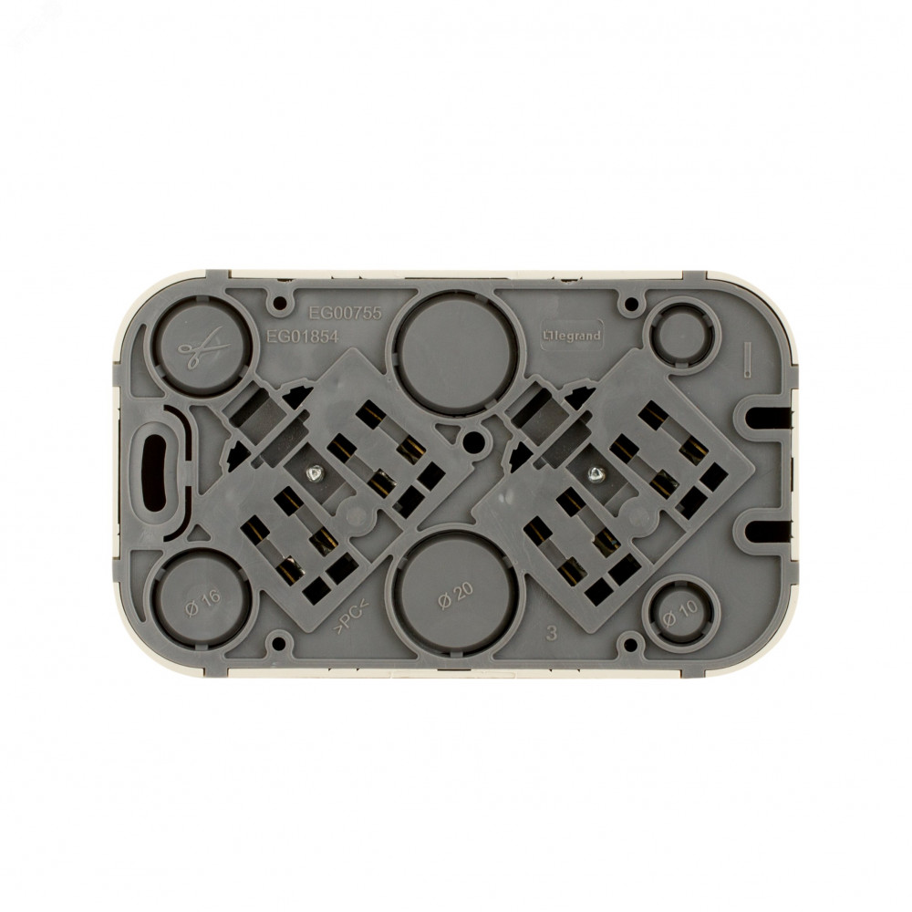 - Перфорация на корпусе для безошибочного вырезания отверстий при монтаже открытой проводки