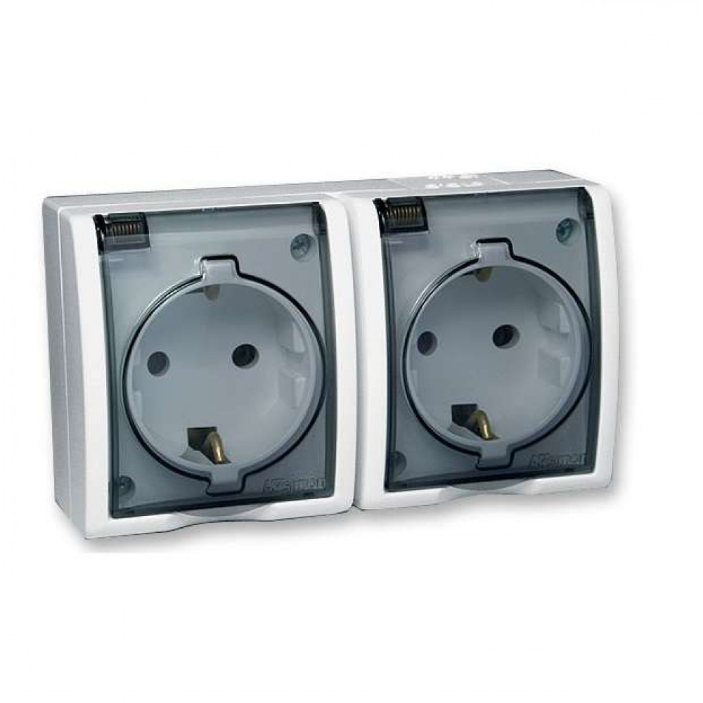 Прямоугольной формы, длиной 122 мм, белого цвета. Предусмотрены защитные шторки, автоматически закрывающие гнезда розетки при вынутой вилке, и прозрачная откидная крышка серого цвета. IP54. Предназначен для накладного монтажа, монтируется на глубину 40 мм, на одном уровне с поверхностью стены.