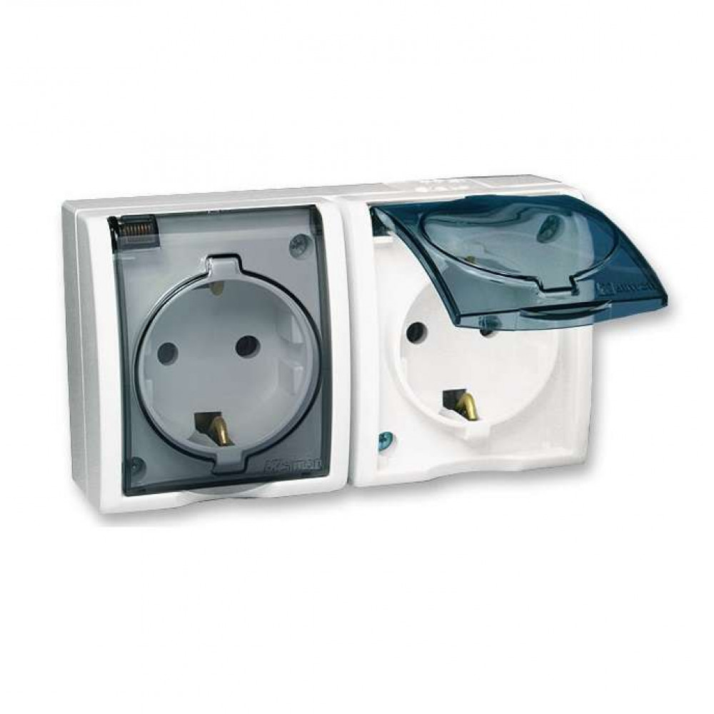 Прямоугольной формы, длиной 122 мм, белого цвета. Предусмотрены защитные шторки, автоматически закрывающие гнезда розетки при вынутой вилке, и прозрачная откидная крышка серого цвета. IP54. Предназначен для накладного монтажа, монтируется на глубину 40 мм, на одном уровне с поверхностью стены.