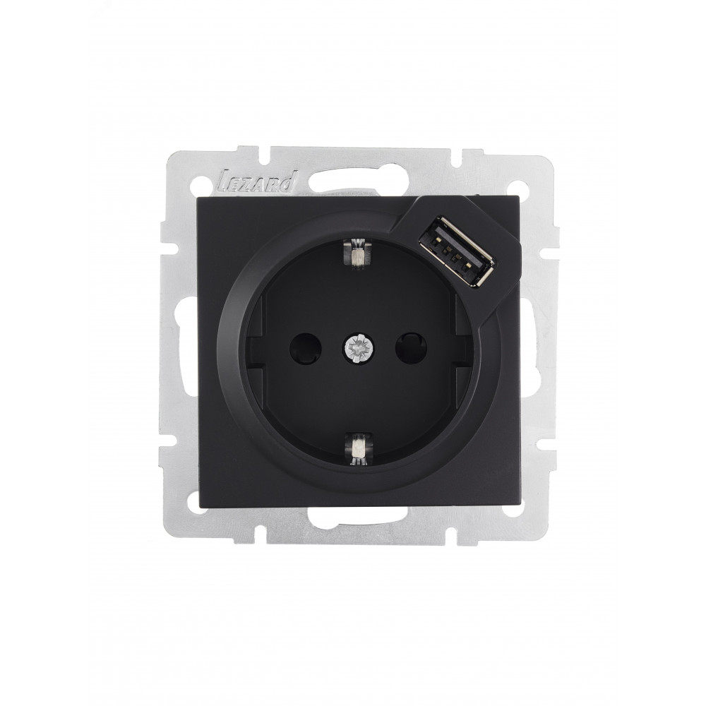 Розетка 1-м СП Vesna с заземл. с заряд. устройством USB механизм черн. бархат 742-4288-181, Розетка скрытого монтажа