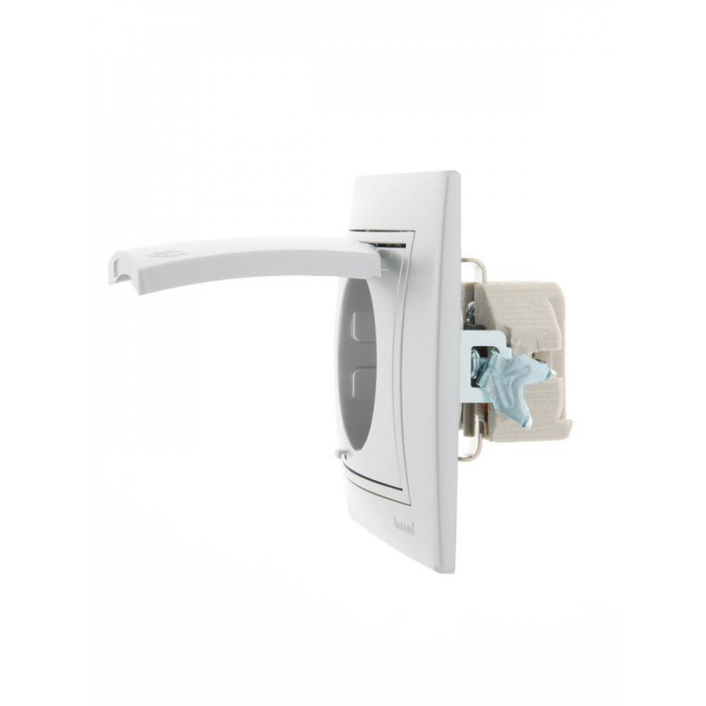Корпус представляет собой форму из негорючего пластика, белого цвета, с защитными шторками, автоматически закрывающими гнезда розетки при вынутой вилке, и защитной крышеой полупрозрачного серого цвета. Основание керамическое. Подпружиненные лапки крепления обеспечивают комфортный и легкий монтаж изделия. Предусмотрена возможность установки без применения монтажной коробки.