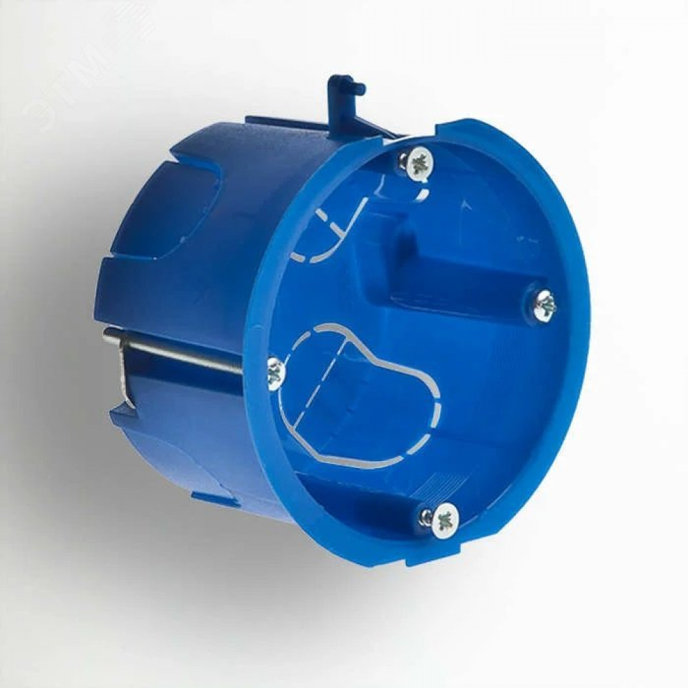Монтажная коробка круглой формы, глубиной 40 мм, изготовлена из пластика, ярко-синего цвета.