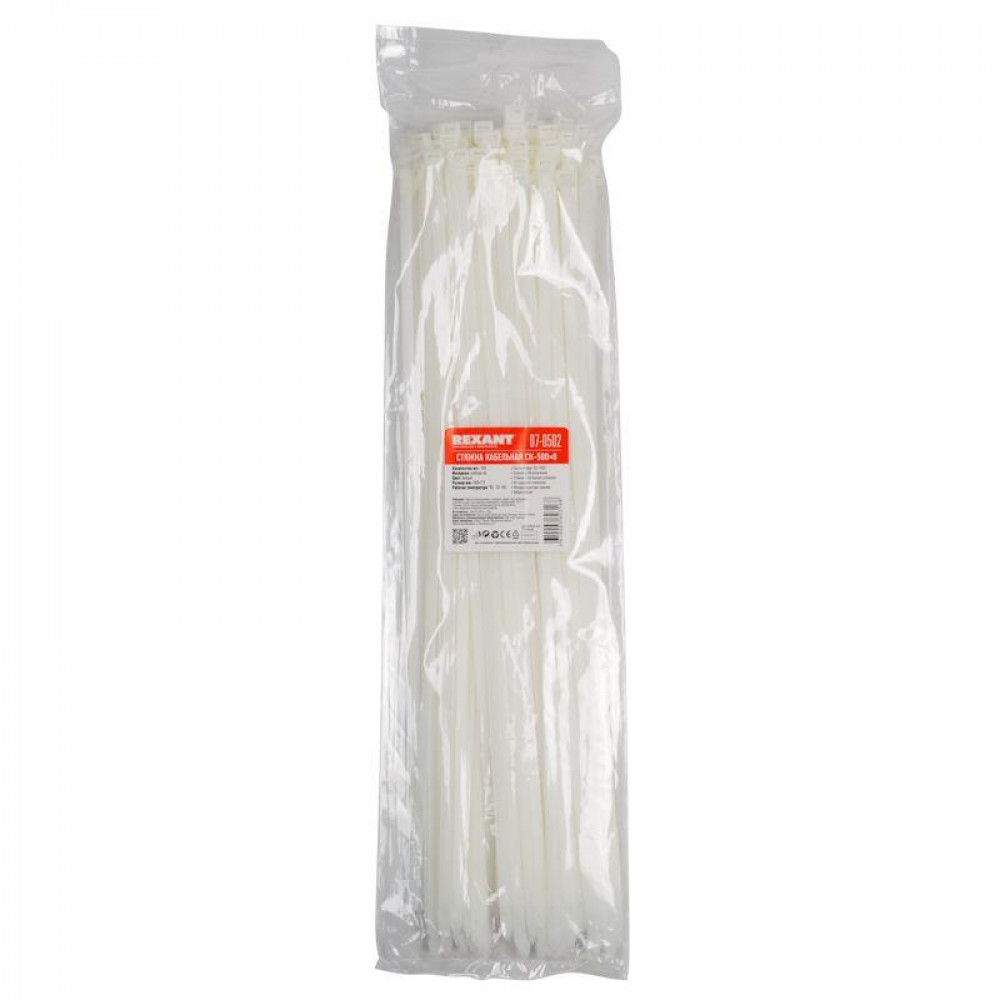 Хомут нейлоновый (кабельная стяжка) 500х7,6 мм белый REXANT предназначен для крепления или обвязки в жгут кабелей и проводов, крепления гибких гофротруб, а также других предметов к несущей поверхности или для соединения между собой. Такая стяжка используется при проведении электромонтажных работ, при монтаже структурированных кабельных систем, для бытовых нужд, а также в других отраслях народного хозяйства.