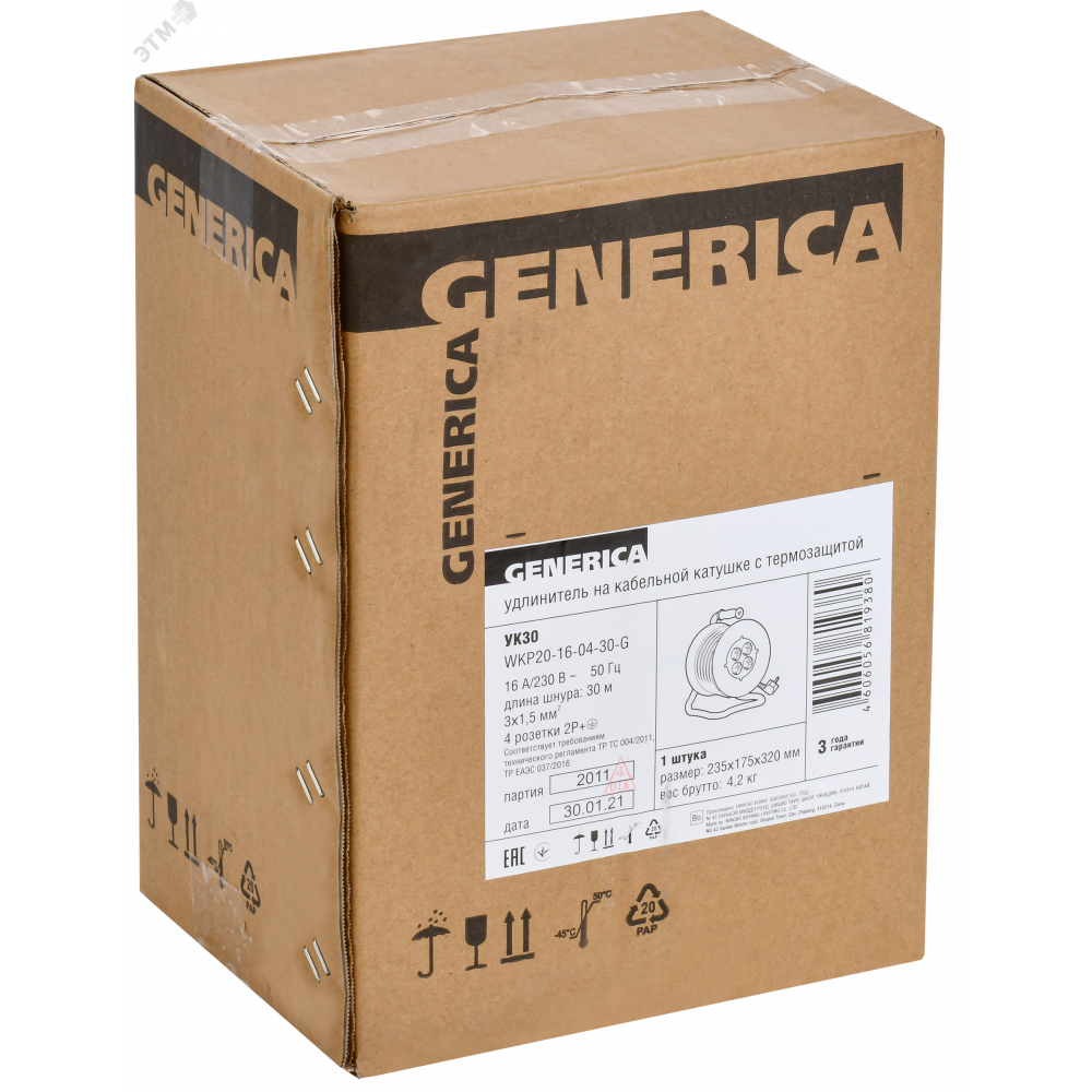 Описание Удлинитель на катушке 4х30м 16А IP20 УК30 2P+PE 3х1.5 термозащита GENERICA WKP20-16-04-30-G