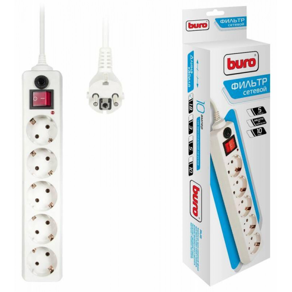 Удлинитель с сетевым фильтром 5х1.8м с заземл. 10А IP20 500SH-1.8-W 2.2кВт CCA бел. 992284, Удлинитель, сетевой фильтр