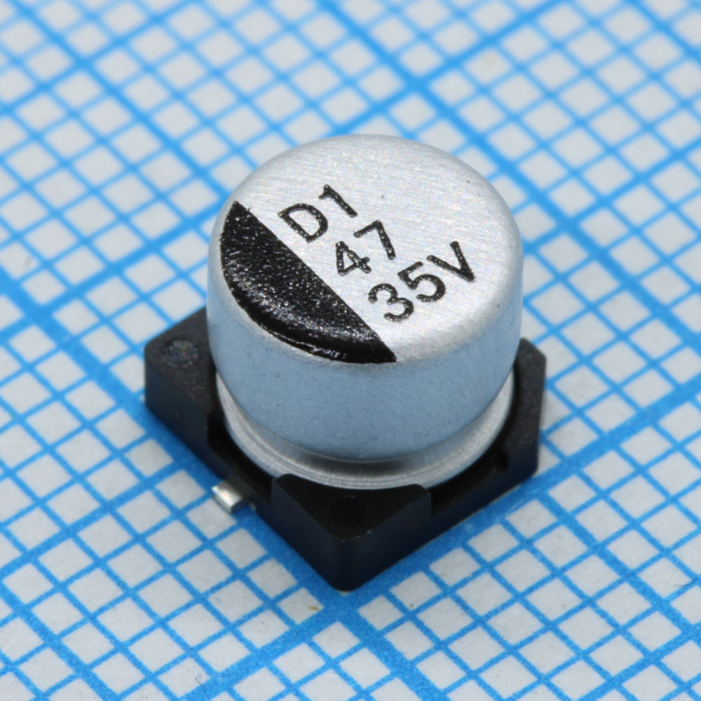 Конденсатор алюминиевый электролитический 47мкФ 35В ±20% (6.3x5.4мм) для поверхностного монтажа 0.8Ом 230мА 2000час 105°С лента на катушке