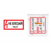 Представляет собой красный прямоугольный контур на белом фоне с с надписью красными буквами и со знаком "молния". Изготовлен из самоклеящейся пленки.