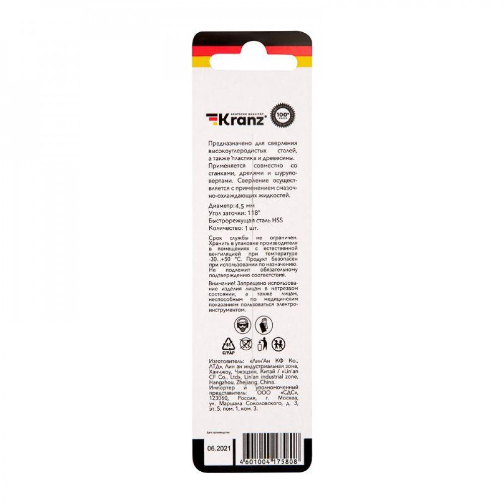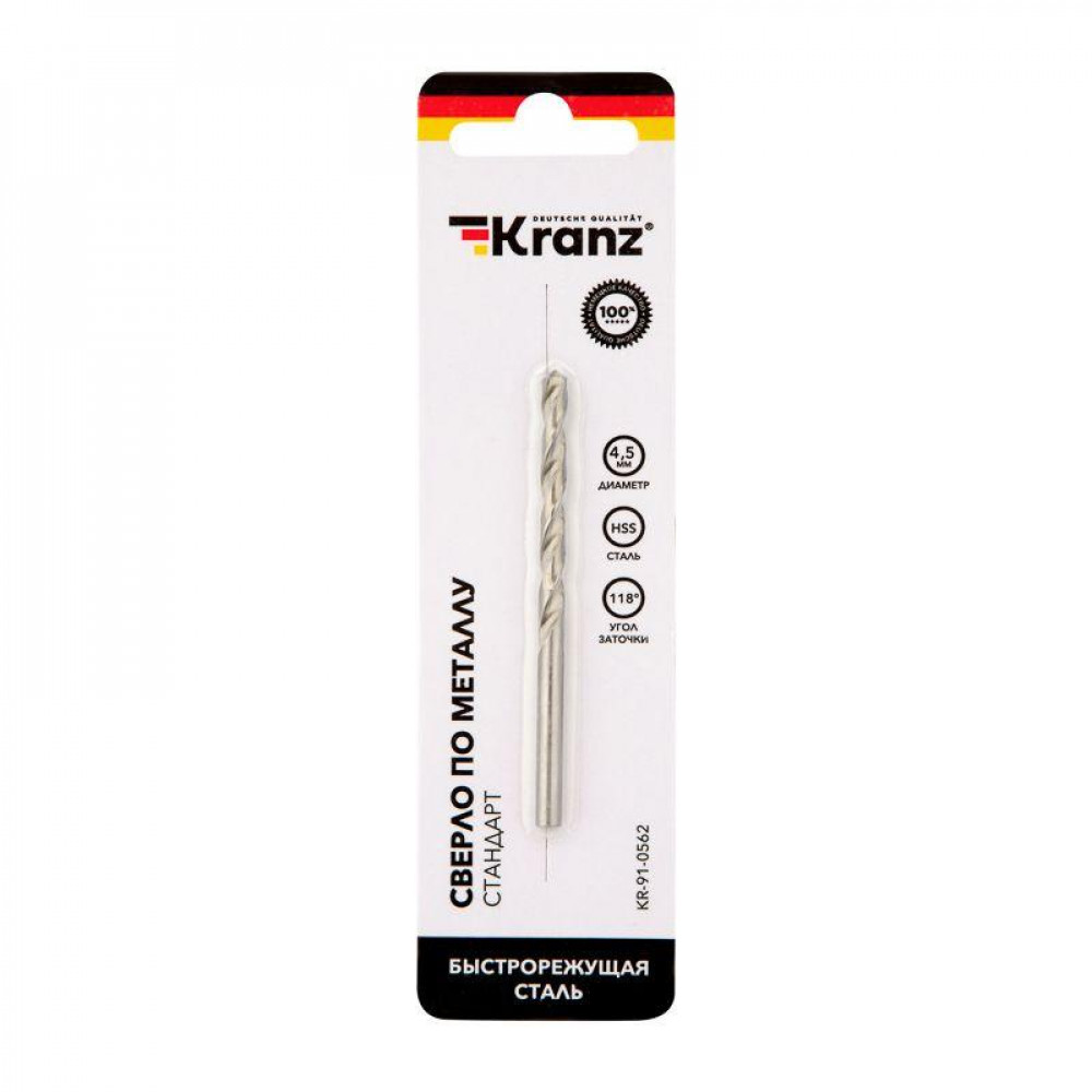 Сверло по металлу 4.5мм HSS DIN 338 (уп.1шт) KR-91-0562, Сверло, метчик, плашка