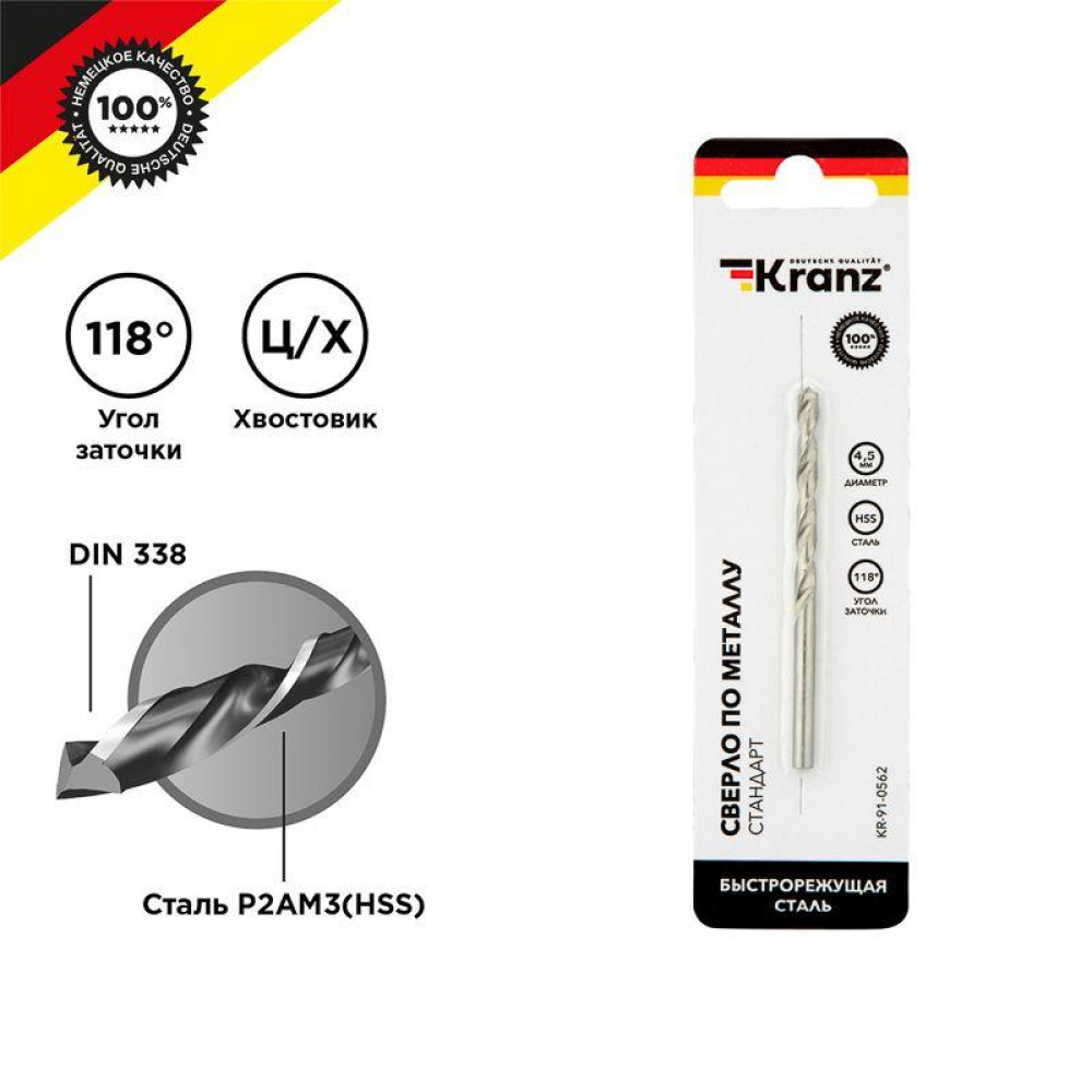 Описание Сверло по металлу 4.5мм HSS DIN 338 (уп.1шт) KR-91-0562