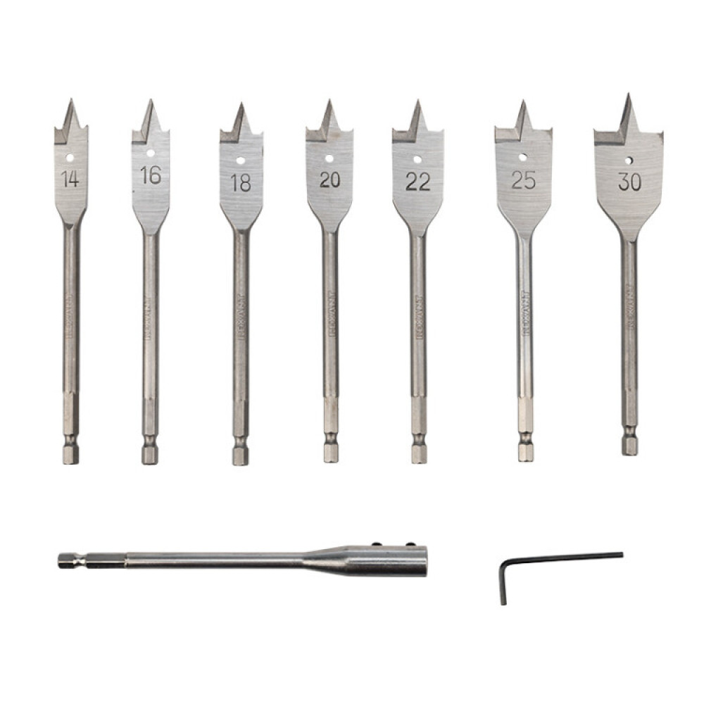 Набор сверл перовых по дереву 9 предметов: 14-16-18-20-22-25-30х152 мм, удлинитель, ключ угловой KR-91-0762, Сверло, метчик, плашка