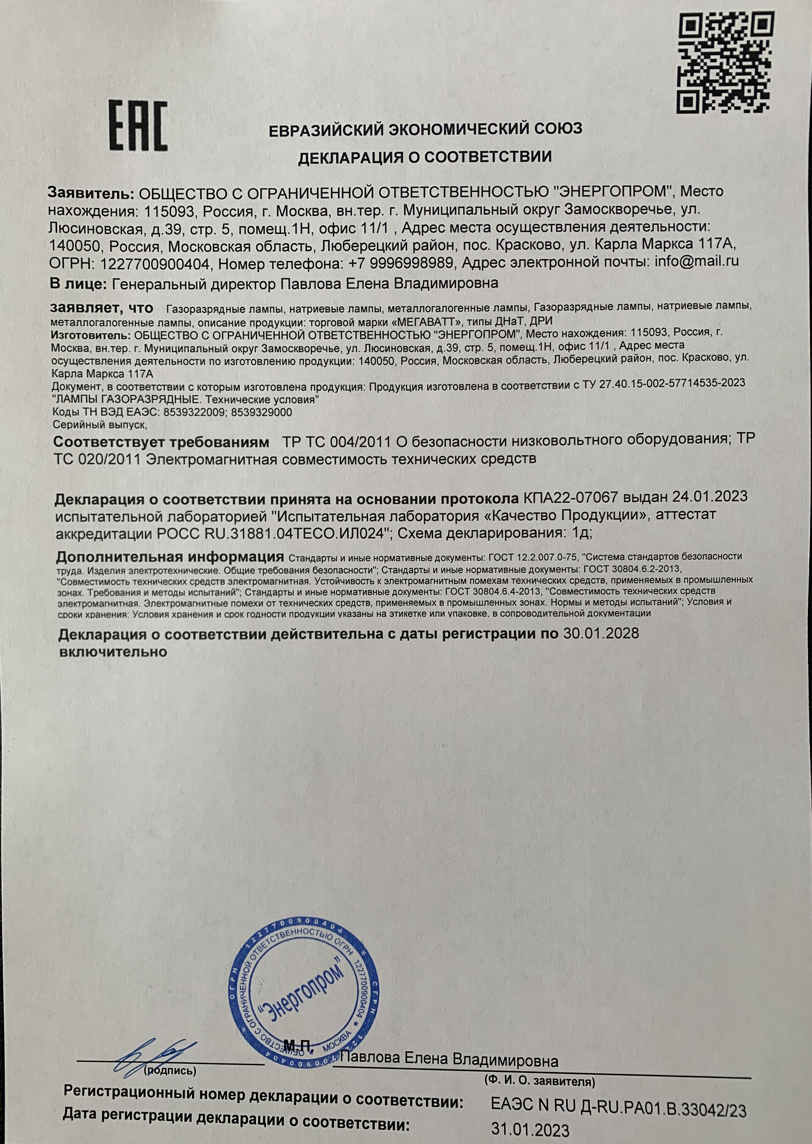 Доставка Лампа газоразрядная металлогалогенная ДРИ 400/4000К E40 (25) 02973
