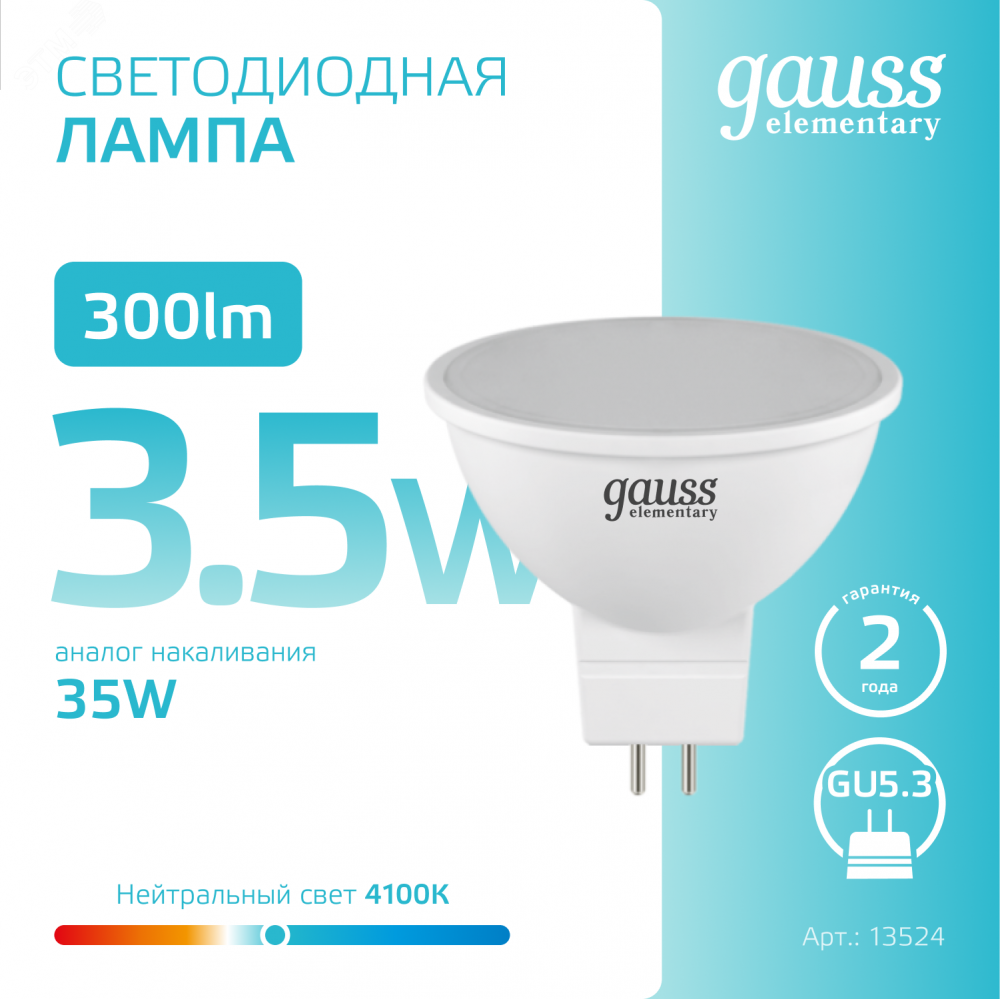 Лампа светодиодная Elementary 3.5Вт MR16 софит 4100К нейтр. бел. GU5.3 300лм 13524, Лампа светодиодная