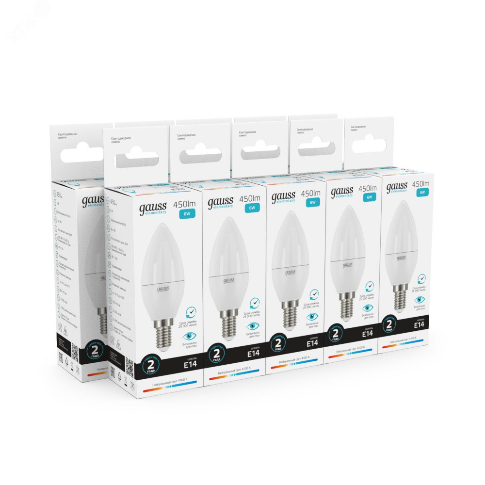 Лампа светодиодная LED Elementary Candle 6Вт E14 4100К Gauss 33126 – лампа с колбой вида "свеча", белого света, длиной 112 мм, диаметром 37 мм, с цоколем Е14, мощностью 6 Вт. Цветовая температура 2700 К.