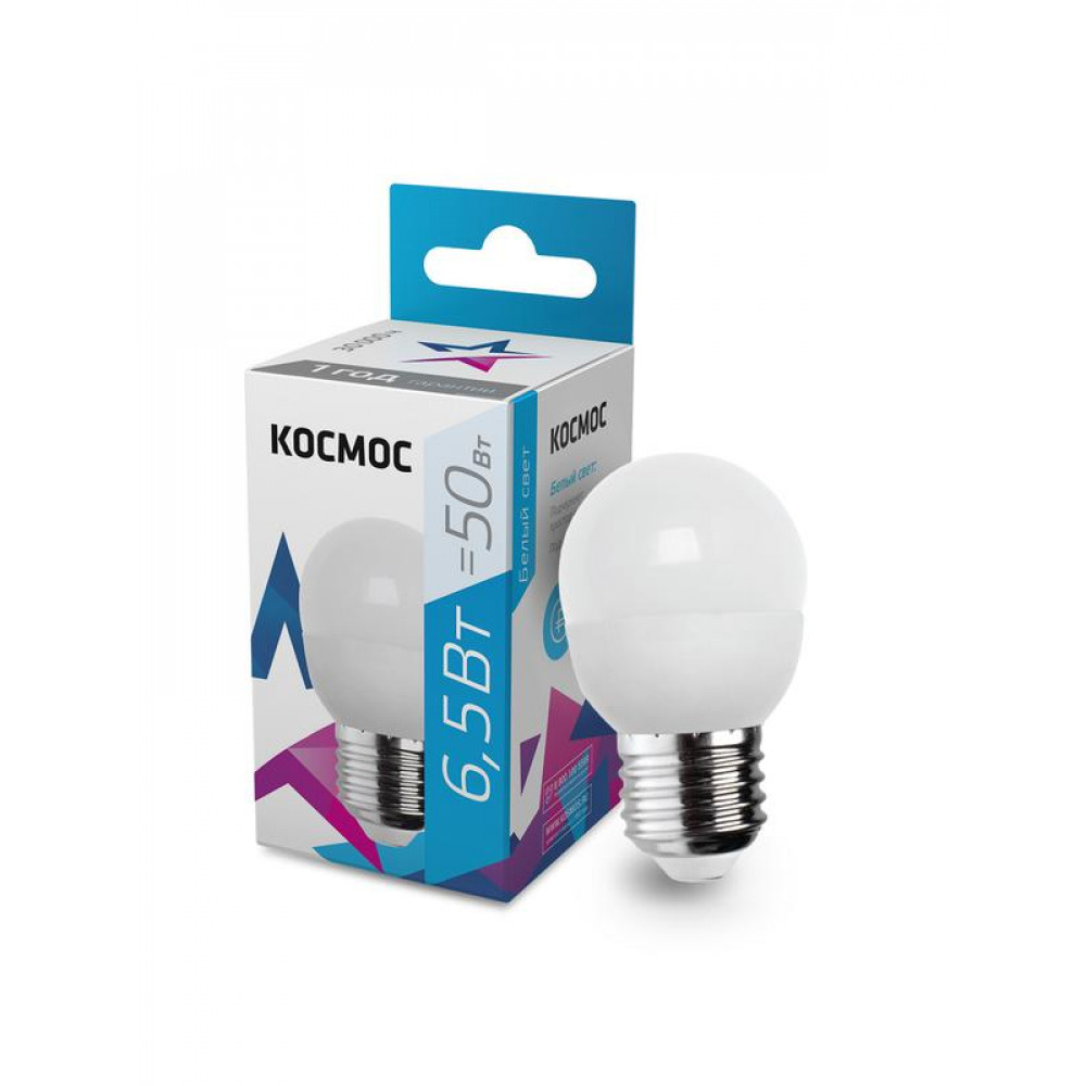 Описание Лампа светодиодная 6.5Вт шар 4500К бел. E27 220В КОСМОС LkecLED6.5wGL45E2745