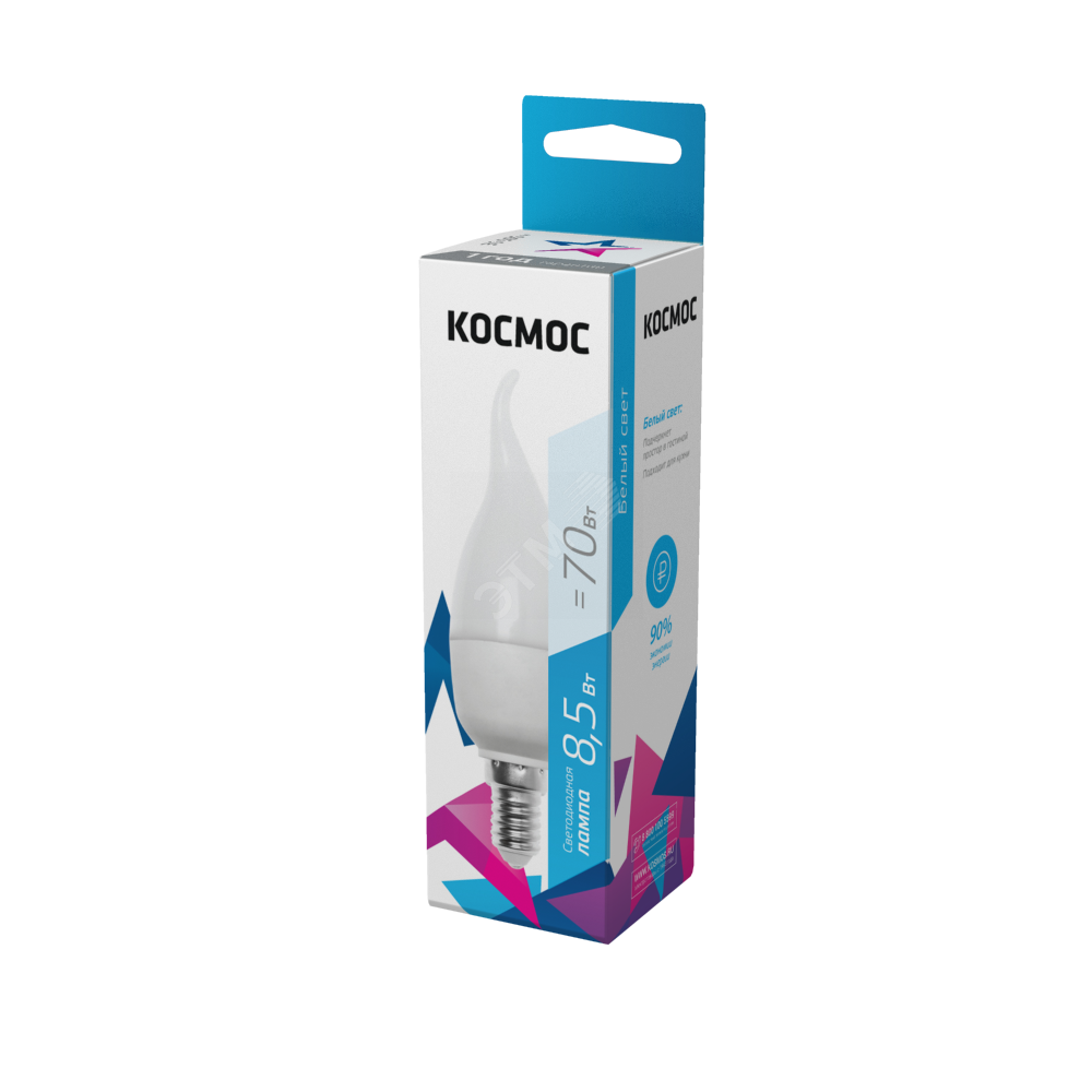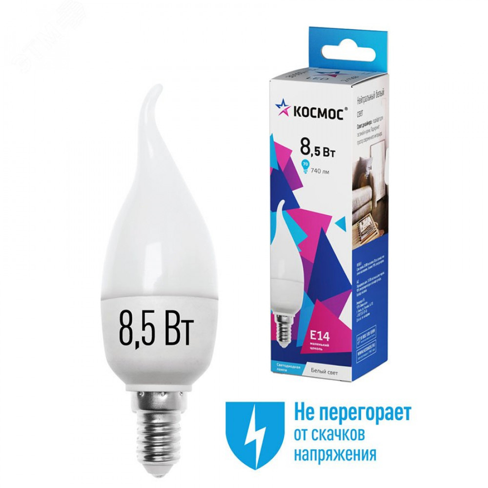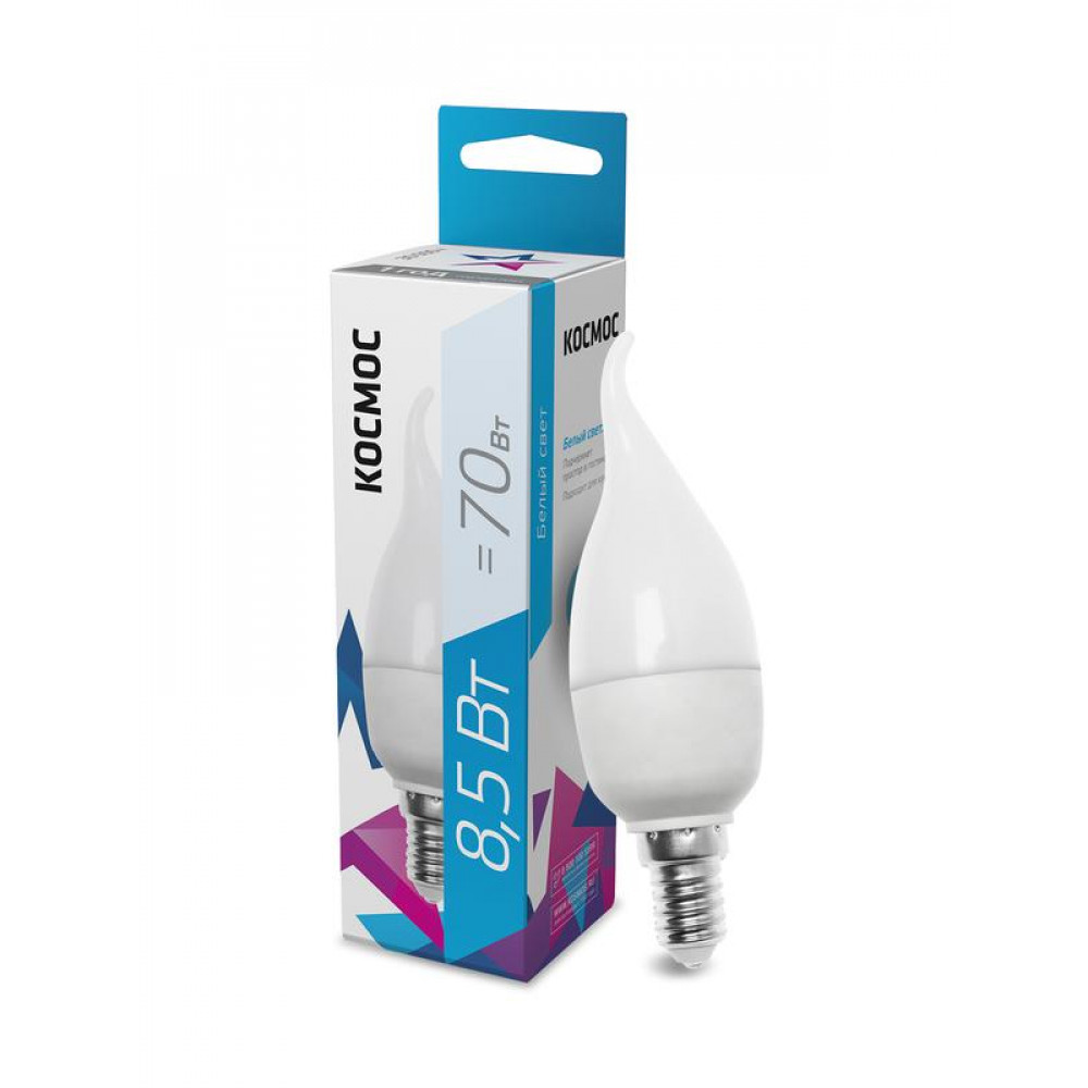Лампа светодиодная 8.5Вт свеча на ветру 4500К бел. E14 220В КОСМОС LkecLED8.5wCWE1445, Лампа светодиодная