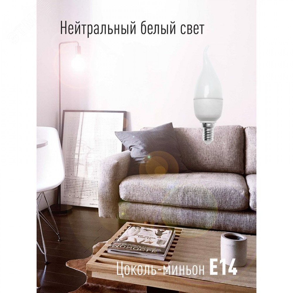 Описание Лампа светодиодная 8.5Вт свеча на ветру 4500К бел. E14 220В КОСМОС LkecLED8.5wCWE1445