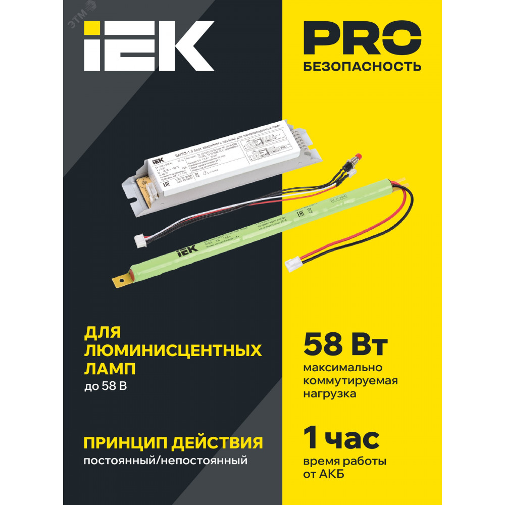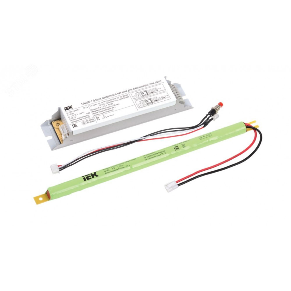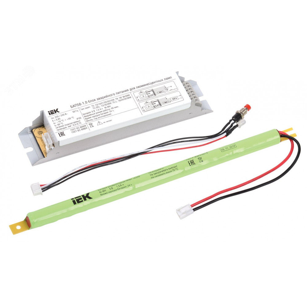 Блок аварийного питания IEK состоит из электронного пускорегулирующего аппарата (конвертера), герметичной никель-металл-гидридной аккумуляторной батареи, светодиодного индикатора наличия сети и подзарядки аккумулятора, кнопки "ТЕСТ".