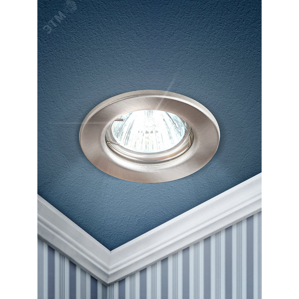 Изготовлен из стали, матового серебристого цвета. Округлой формы, плоский, с неподвижной внутренней частью с матовым ободом по окружности. Диаметр 80 мм, диаметр отверстия 60 мм, с цоколем GU5.3.