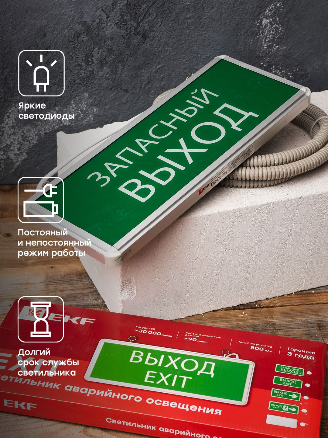 Светильники аварийного освещения EKF предназначены для указания выходов и освещения эвакуационных путей в общественных, жилых или промышленных помещениях. Источником света являются светодиоды (LED) с длительным сроком службы и высокой яркостью. Надежные Ni-Cd и Li-ion-аккумуляторы обеспечивают время работы в автономном режиме до 180 минут.