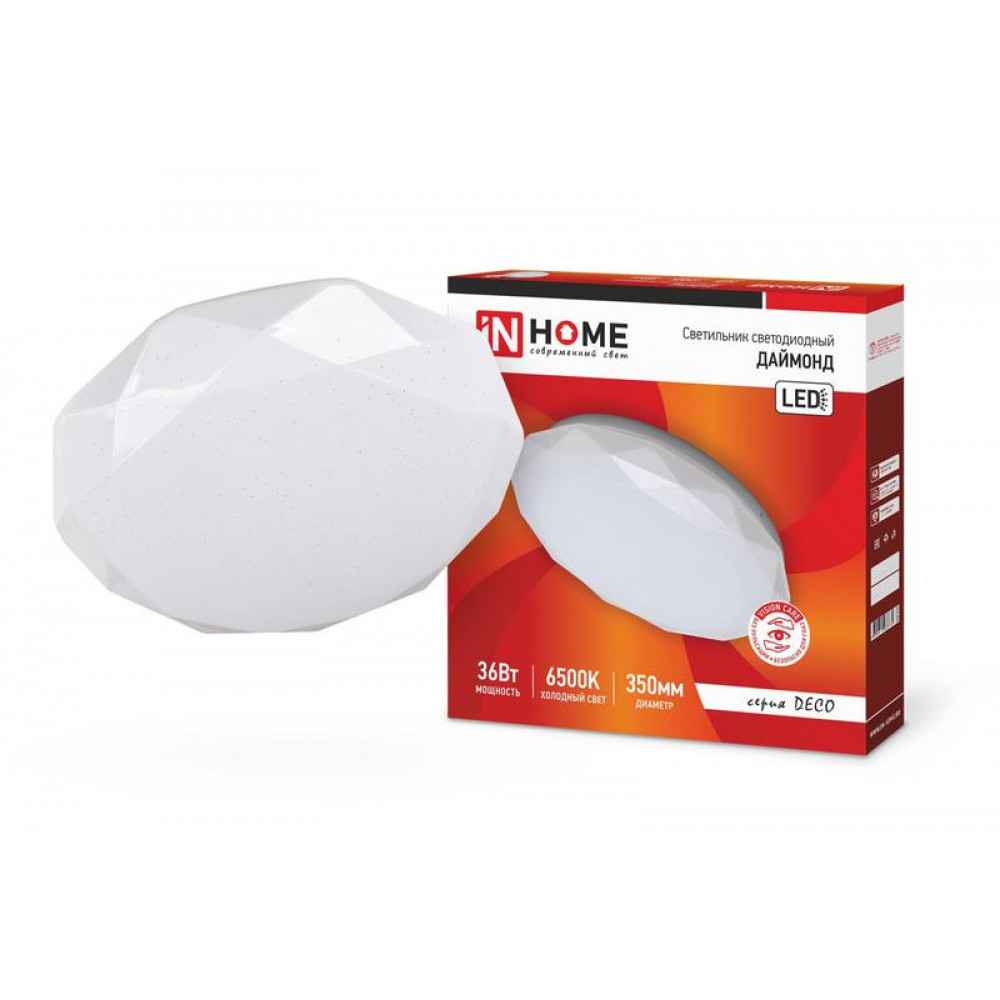 Светодиодный накладной светильник потолочно-настенного типа ДАЙМОНД серии DECO INhome выполнен в оригинальной форме ограненного бриллианта. Линейка светильников ДАЙМОНД представлена в трех размерах от 190 до 350 мм в диаметре. Несколько вариаций мощности (в диапазоне от 12 Вт до 36 Вт) позволяют подобрать оптимальный осветительный прибор в зависимости от конфигурации и габаритов помещения. Применение Светодиодные светильники ДАЙМОНД серии DECO обеспечат экономичное освещение домашних интерьеров, отелей, офисных и административных зданий, торговых залов, сферы ЖКХ, а также помещений вспомогательного назначения: холлов, коридоров, лестничных пролётов, подсобок и других. Преимущества Современные светильники серии DECO, работающие на основе последнего поколения светодиодов, обеспечивают яркий равномерный световой поток при максимальной экономии электроэнергии. Отсутствие пульсации гарантирует сохранность здоровья глаз. Светодиодные светильники являются одним из самых экологически безвредных источников света и не требуют специальной утилизации и переработки. Светильники по?