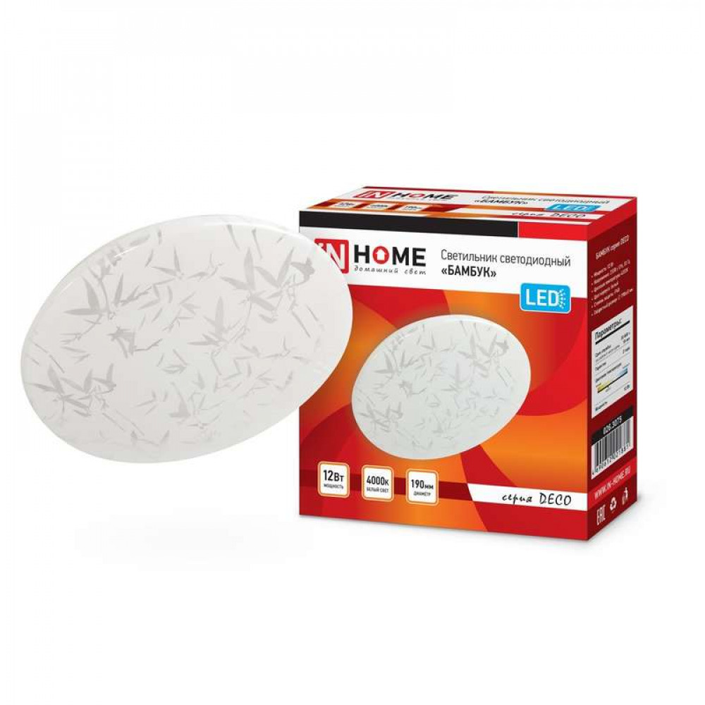 Светодиодный светильник БАМБУК серии DECO от ТМ In Home в светлом матовом корпусе украшен принтом в виде стилизованных листьев бамбука. Согласно древнему китайскому учению фен-шуй, изображение этого растения приносит в дом удачу, счастье и процветание. Линейка светильников БАМБУК представлена в трех размерах от 190 до 350 мм. Несколько вариаций мощности (в диапазоне от 12 Вт до 36 Вт) позволяют подобрать оптимальный осветительный прибор, в зависимости от конфигурации и габаритов помещения. Применение Светодиодные светильники БАМБУК серии DECO предназначены для внутреннего освещения жилых помещений, подъездов и сферы ЖКХ, офисных и административных учреждений, магазинов, а также холлов, коридоров, лестничных пролётов, подсобок и других помещений вспомогательного назначения. Преимущества Современные светильники серии DECO, работающие на основе последнего поколения светодиодов, обеспечивают яркий равномерный световой поток при максимальной экономии электроэнергии. Отсутствие пульсации гарантирует сохранность здоровья глаз. Светодиодные светильники являются одним из самых экол