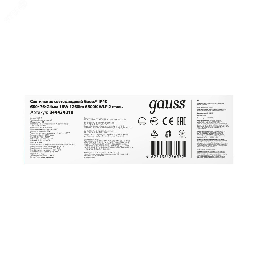 Описание СВ-К СВЕТОДИОДНЫЙ IP20 595*74*24ММ 18W 1170LM 6500K CTAЛЬ 1/20 844424318