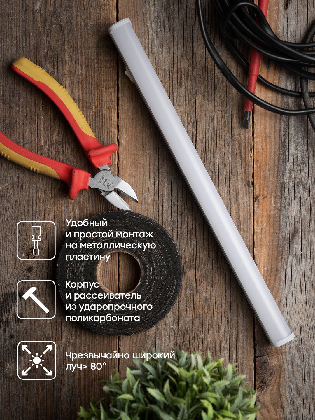 Линейный светодиодный светильник ДБОВ-7101 может быть и отдельным источником света, и частью системы освещения. Благодаря шлейфовому соединению вы можете устанавливать до 20 светильников в линию. Модель сделана из УВ-стабилизированного поликарбоната, устойчивого к химическому воздействию. Серия светильников с выключателем обладает высокими индексом цветопередачи — не менее 80 Ra.