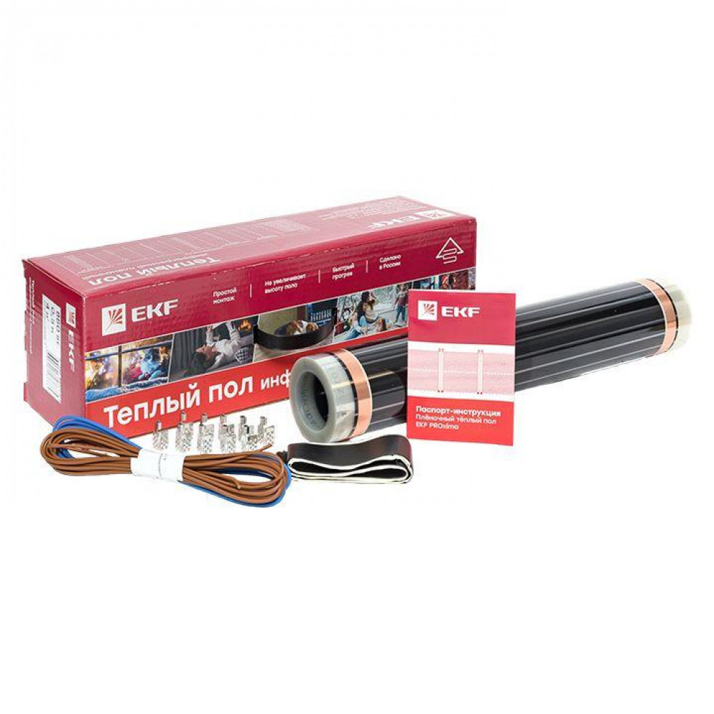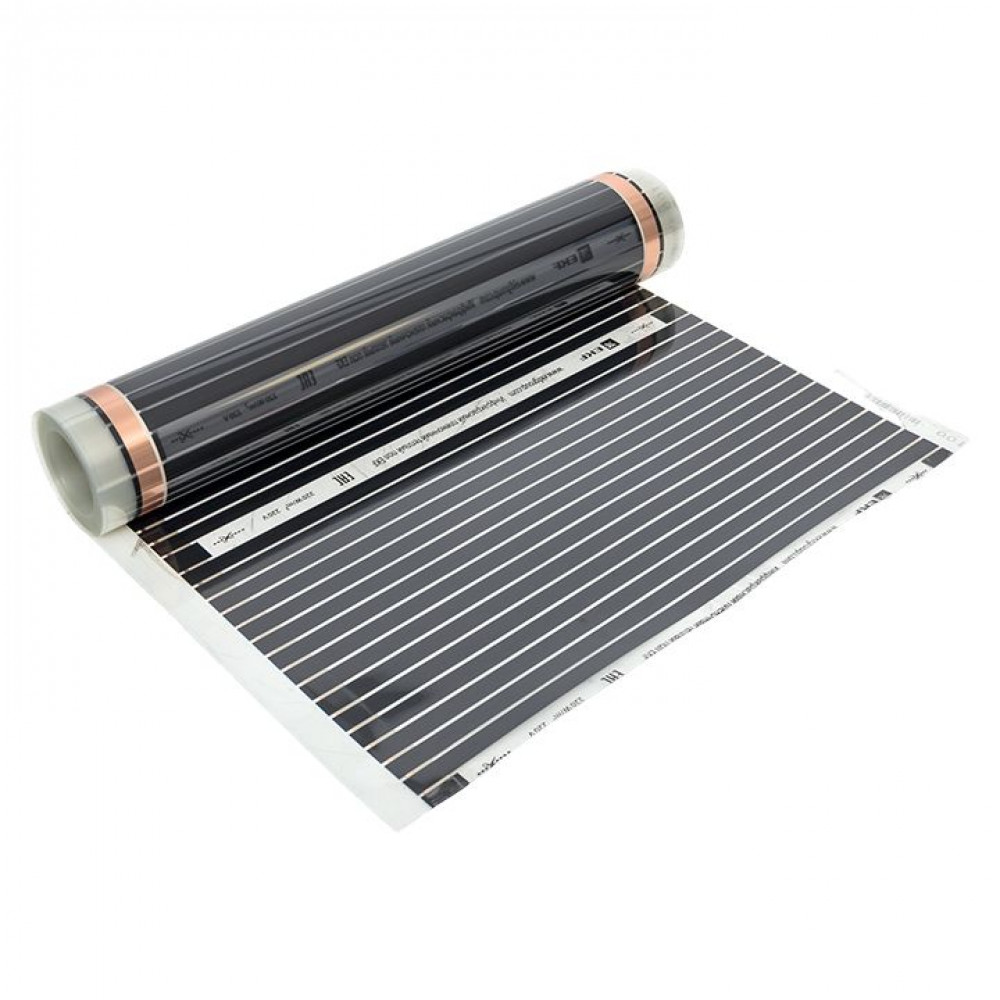 Пленочный теплый пол EKF применяется для сухого монтажа без стяжки не только при капитальном ремонте, но и при косметическом. Толщина пленки -0,338 мм. Обеспечивает быстрый и легкий монтаж. Идеально подходит для укладки под ламинат, паркетную доску, мягкое напольное покрытие: линолеум, ковролин. Инфракрасный пленочный теплый пол состоит из следующих элементов. Полосы углеродного материала шириной около 1,5 см соединены между собой при помощи медных шин с серебряным покрытием, которые и проводят электрический ток. Нагревательный элемент заламинирован с двух сторон плотным полимером, который не задерживает инфракрасное излучение и обеспечивает отличную защиту от попадания влаги, пробоев и возгорания.