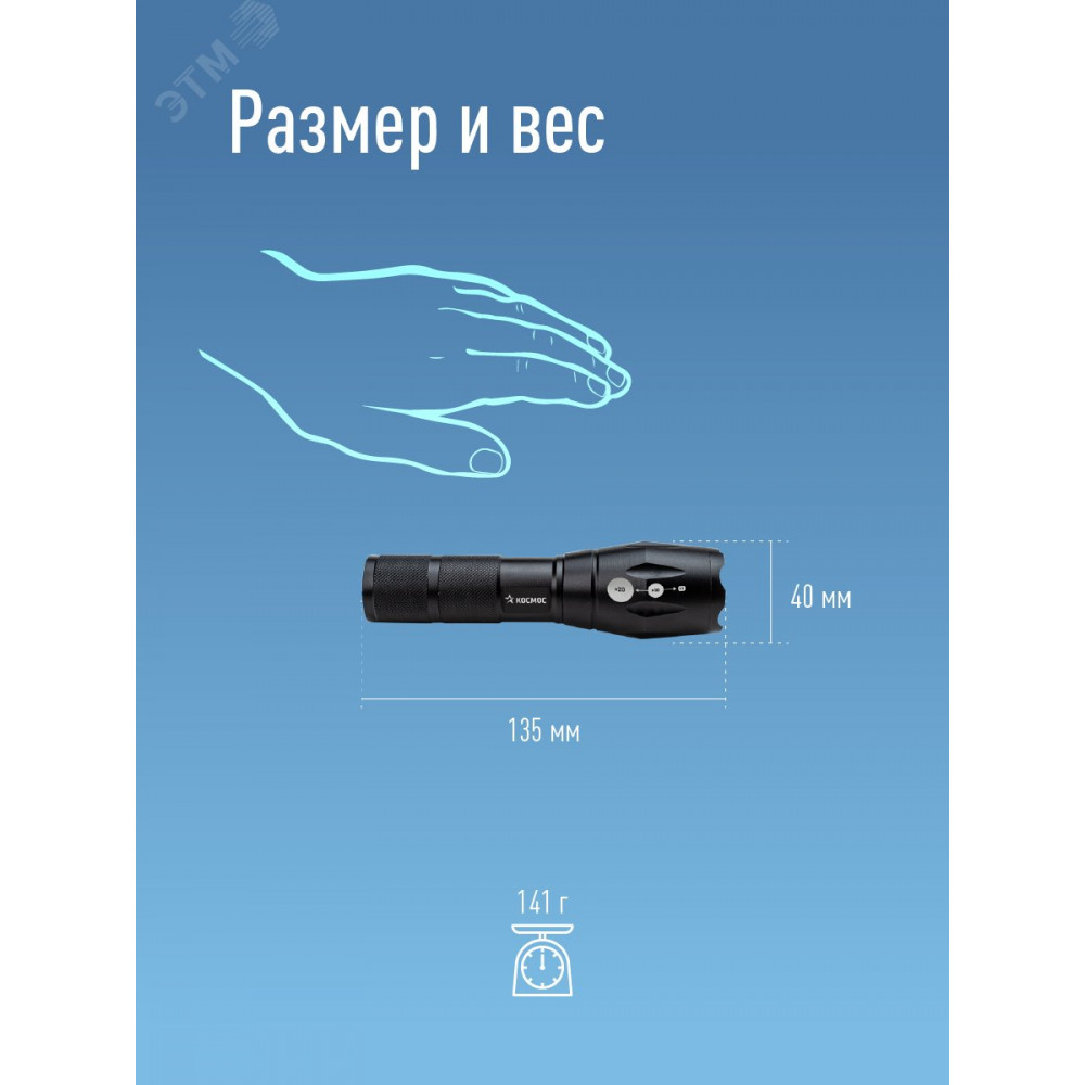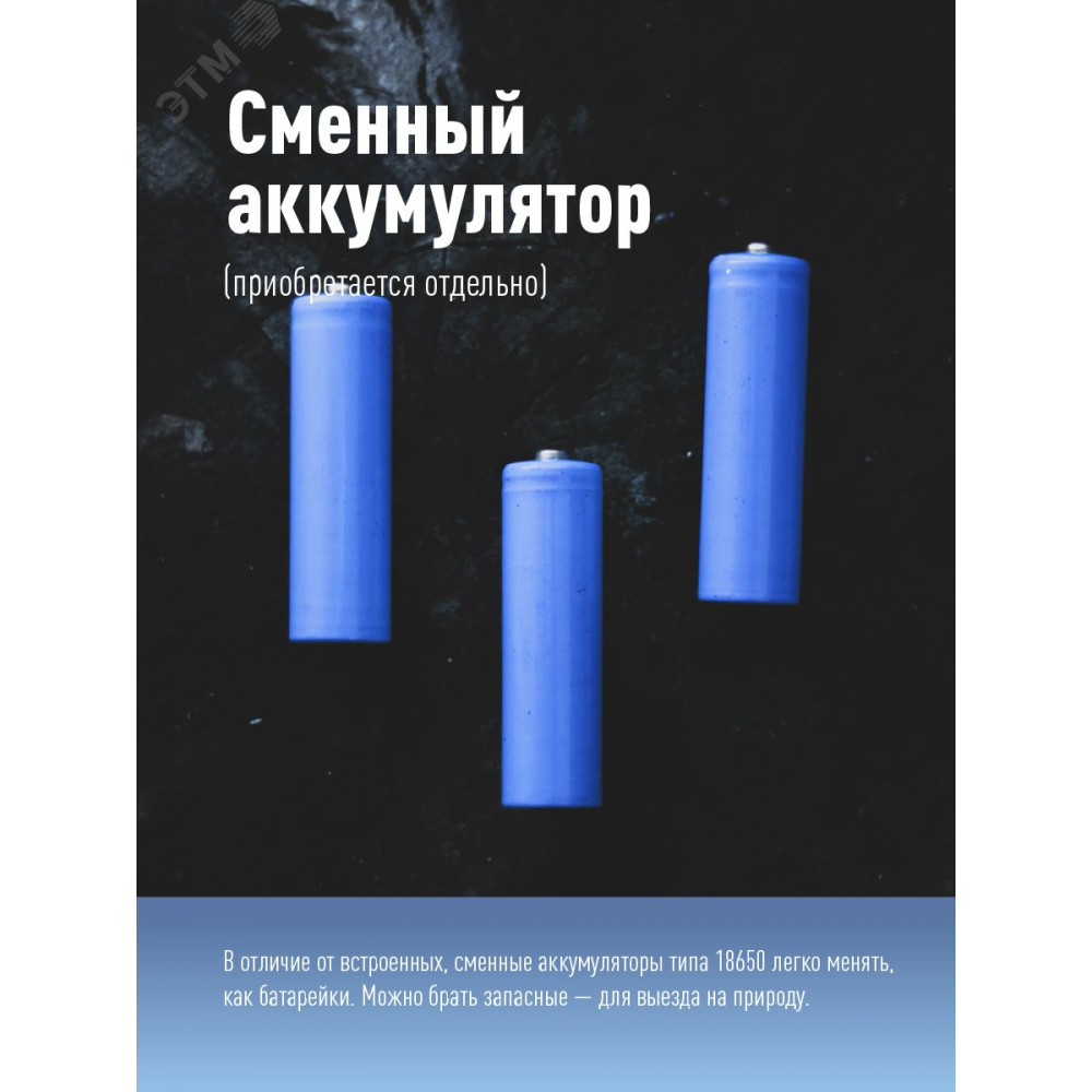 Работает от 3 батареек ААА, либо можно установить 1 сменный литиевый аккумулятор типоразмера 18650. Упакован в блистер – фонарь хорошо видно в упаковке.