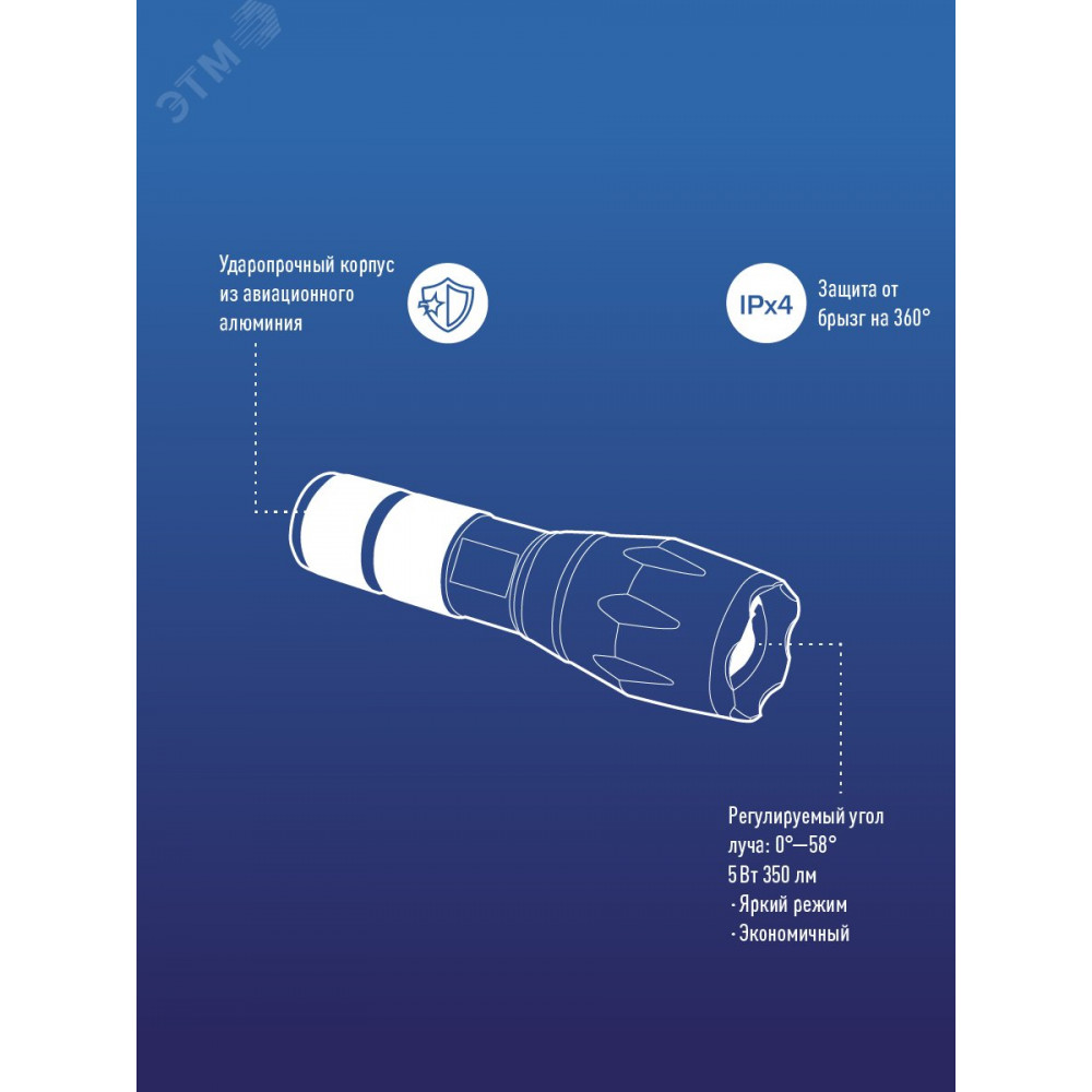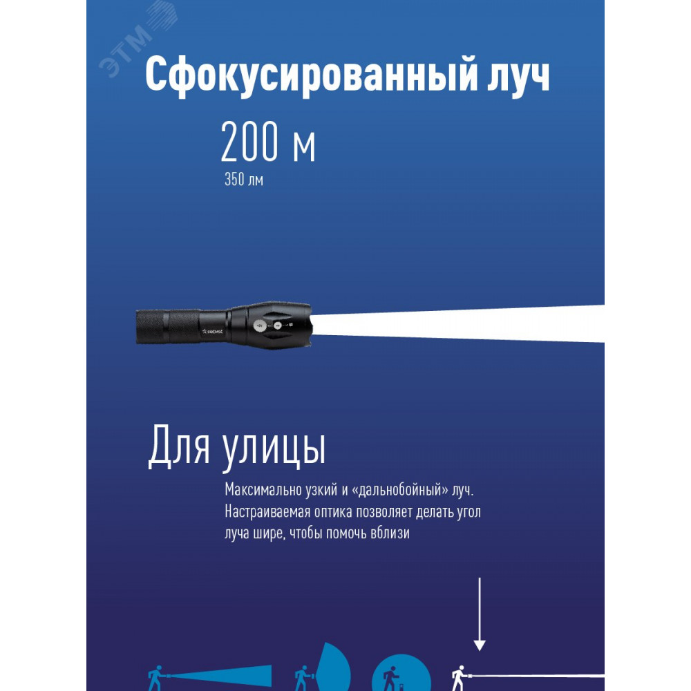 Фонарь рекордной дальности луча в прочном металлическом корпусе. Дальний узконаправленный луч – самый «дальнобойный», оптика позволяет настроить ширину луча. Длина луча – более 200 м, время беспрерывной работы – до 5 ч в режиме основного света, до 10 в режиме эконом. 2 режима работы – яркий и экономичный.