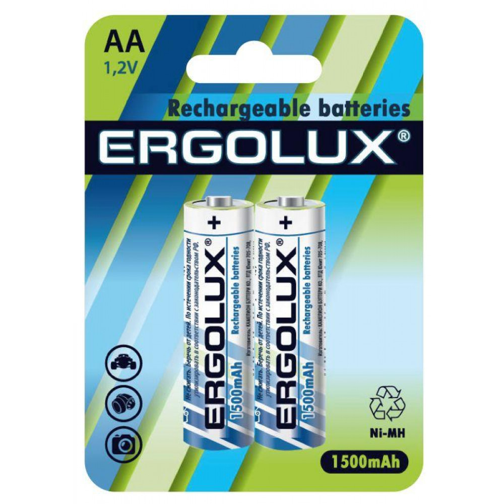 Аккумулятор Ergolux AA-1500mAh Ni-Mh BL-2 (NHAA1500BL2, 1.2В), напряжение 1,2В, емкость 1500мА*ч, кол-во в упаковке 2 шт., размер упаковки 90x117x15 мм, использовать при температуре от - 20 до + 40 °C