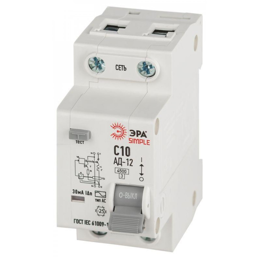 Описание Выключатель автоматический дифференциального тока 1P+N С10 30мА тип АС АВДТ 4.5кА SIMPLE D12E2C10AC30 АД-12 электронное Б0058919